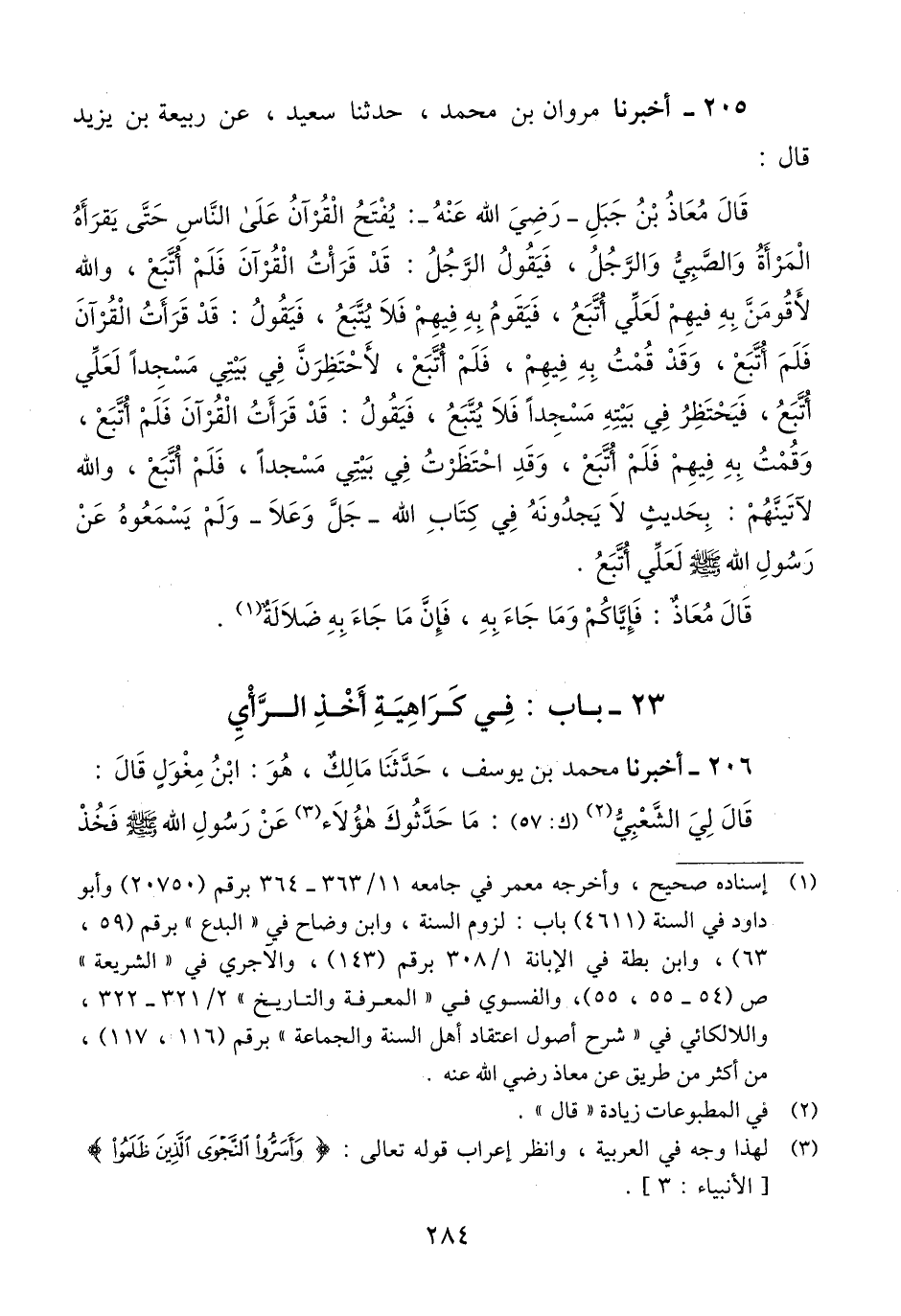 205 - أَخْبَرَنَا مَرْوَانُ بْنُ مُحَمَّدٍ، حَدَّثَنَا سَعِيدٌ، عَنْ رَبِيعَةَ بْنِ يَزِيدَ، قَالَ: قَالَ مُعَاذُ بْنُ جَبَلٍ رَضِيَ اللَّهُ عَنْهُ، " §يُفْتَحُ الْقُرْآنُ عَلَى النَّاسِ حَتَّى يَقْرَأَهُ الْمَرْأَةُ وَالصَّبِيُّ وَالرَّجُلُ، فَيَقُولُ الرَّجُلُ: قَدْ قَرَأْتُ الْقُرْآنَ فَلَمْ أُتَّبَعُ، وَاللَّهِ لَأَقُومَنَّ بِهِ فِيهِمْ لَعَلِّي أُتَّبَعُ، فَيَقُومُ بِهِ فِيهِمْ فَلَا يُتَّبَعُ، فَيَقُولُ: قَدْ قَرَأْتُ الْقُرْآنَ فَلَمْ أُتَّبَعْ، وَقَدْ قُمْتُ بِهِ فِيهِمْ، فَلَمْ أُتَّبَعْ، لَأَحتَظِرَنَّ فِي بَيْتِي مَسْجِدًا لَعَلِّي أُتَّبَعُ، فَيَحْتَظِرُ فِي بَيْتِهِ مَسْجِدًا فَلَا يُتَّبَعُ، فَيَقُولُ: قَدْ قَرَأْتُ الْقُرْآنَ فَلَمْ أُتَّبَعْ، وَقُمْتُ بِهِ فِيهِمْ فَلَمْ أُتَّبَعْ، وَقَدِ احْتظرْتُ فِي بَيْتِي مَسْجِدًا، فَلَمْ أُتَّبَعْ، وَاللَّهِ لَآتِيَنَّهُمْ: بِحَدِيثٍ لَا يَجِدُونَهُ فِي كِتَابِ اللَّهِ - جَلَّ وَعَلَا - وَلَمْ يَسْمَعُوهُ عَنْ رَسُولِ اللَّهِ صَلَّى اللهُ عَلَيْهِ وَسَلَّمَ لَعَلِّي أُتَّبَعُ قَالَ مُعَاذٌ: فَإِيَّاكُمْ وَمَا جَاءَ بِهِ فَإِنَّ مَا جَاءَ بِهِ ضَلَالَةٌ "Qإسناده صحيح