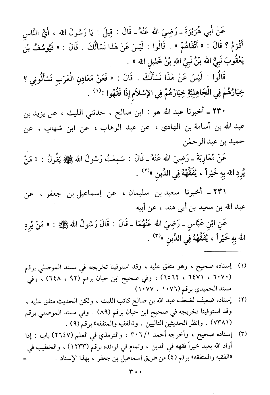 230 - أَخْبَرَنَا عَبْدُ اللَّهِ هُوَ ابْنُ صَالِحٍ، حَدَّثَنِي اللَّيْثُ، عَنْ يَزِيدَ بْنِ عَبْدِ اللَّهِ بْنِ أُسَامَةَ بْنِ الْهَادِ، عَنْ عَبْدِ الْوَهَّابِ، عَنِ ابْنِ شِهَابٍ، عَنْ حُمَيْدِ بْنِ عَبْدِ الرَّحْمَنِ، عَنْ مُعَاوِيَةَ رَضِيَ اللَّهُ عَنْهُ، قَالَ: سَمِعْتُ رَسُولَ اللَّهِ صَلَّى اللهُ عَلَيْهِ وَسَلَّمَ يَقُولُ: «§مَنْ يُرِدِ اللَّهُ بِهِ خَيْرًا يُفَقِّهْهُ فِي الدِّينِ» Qإسناده ضعيف لضعف عبد الله بن صالح كاتب الليث ولكن الحديث متفق عليه
