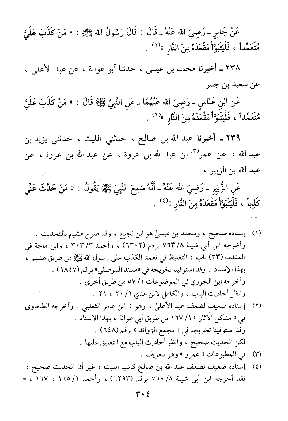 239 - أَخْبَرَنَا عَبْدُ اللَّهِ بْنُ صَالِحٍ، حَدَّثَنِي اللَّيْثُ، حَدَّثَنِي يَزِيدُ بْنُ عَبْدِ اللَّهِ، عَنْ عُمَرَ بْنِ عَبْدِ اللَّهِ بْنِ عُرْوَةَ، عَنْ عَبْدِ اللَّهِ بْنِ عُرْوَةَ، عَنْ عَبْدِ اللَّهِ بْنِ الزُّبَيْرِ، عَنِ الزُّبَيْرِ رَضِيَ اللَّهُ عَنْهُ، أَنَّهُ سَمِعَ النَّبِيَّ صَلَّى اللهُ عَلَيْهِ وَسَلَّمَ يَقُولُ: «§مَنْ حَدَّثَ عَنِّي كَذِبًا، فَلْيَتَبَوَّأْ مَقْعَدَهُ مِنَ النَّارِ» Qإسناده ضعيف لضعف عبد الله بن صالح كاتب الليث غير أن الحديث صحيح