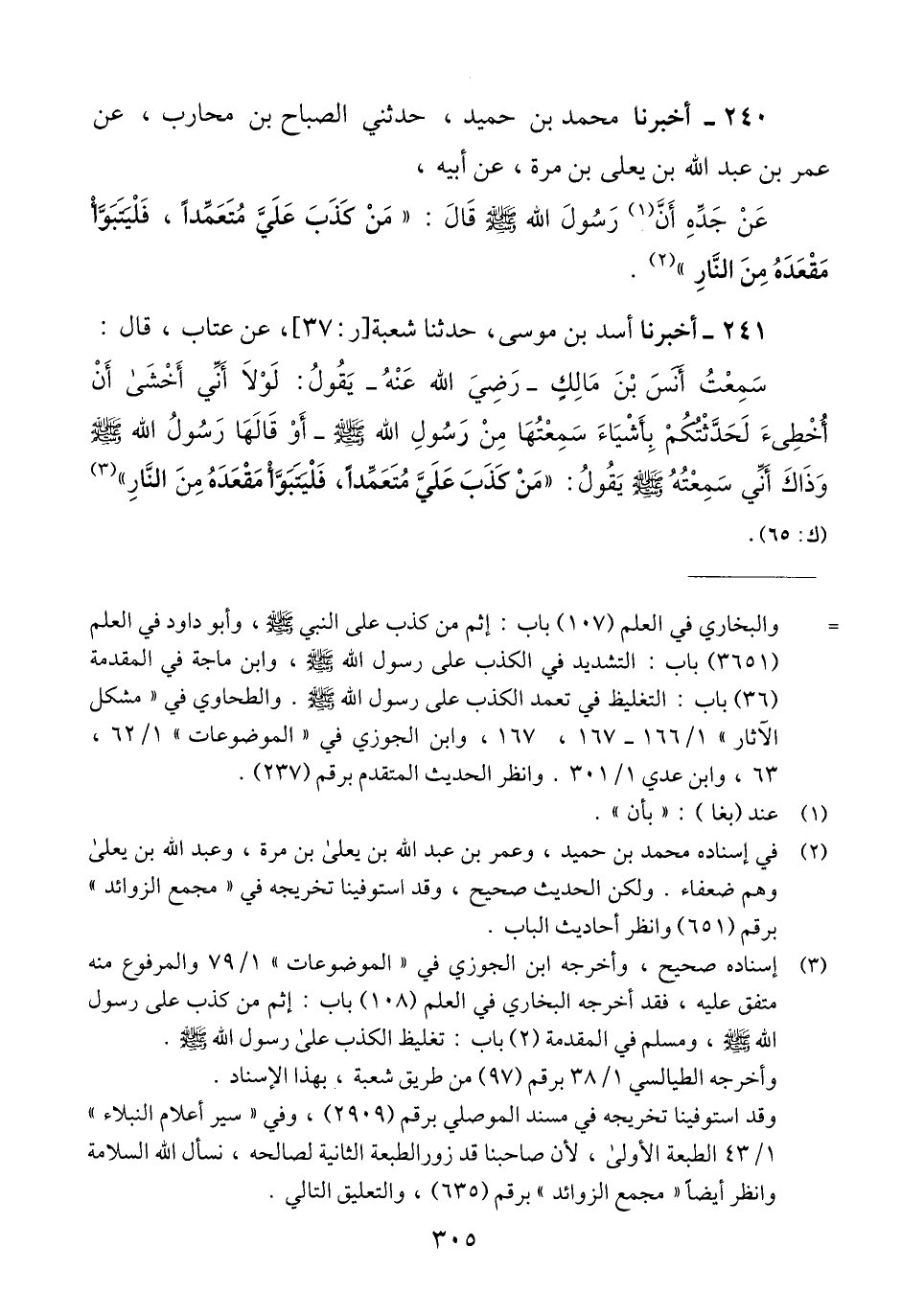 240 - أَخْبَرَنَا مُحَمَّدُ بْنُ حُمَيْدٍ، حَدَّثَنِي الصَّبَّاحُ بْنُ مُحَارِبٍ، عَنْ عُمَرَ بْنِ عَبْدِ اللَّهِ بْنِ يَعْلَى بْنِ مُرَّةَ، عَنْ أَبِيهِ عَنْ جَدِّهِ أَنَّ رَسُولَ اللَّهِ صَلَّى اللهُ عَلَيْهِ وَسَلَّمَ قَالَ: «§مَنْ كَذَبَ عَلَيَّ مُتَعَمِّدًا، فَلْيَتَبَوَّأْ مَقْعَدَهُ مِنَ النَّارِ» Qفي إسناده محمد بن حميد وعمر بن عبد الله بن يعلى بن مرة وعبد الله بن يعلى وهم ضعفاء. ولكن الحديث صحيح