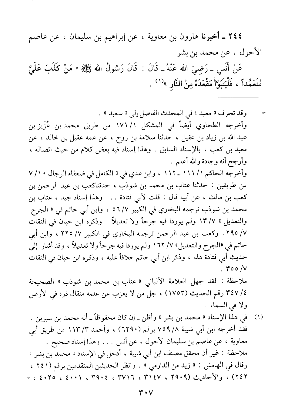 244 - أَخْبَرَنَا هَارُونُ بْنُ مُعَاوِيَةَ، عَنْ إِبْرَاهِيمَ بْنِ سُلَيْمَانَ، عَنْ عَاصِمٍ الْأَحْوَلِ، عَنْ مُحَمَّدِ بْنِ بِشْرٍ، عَنْ أَنَسٍ رَضِيَ اللَّهُ عَنْهُ، قَالَ: قَالَ رَسُولُ اللَّهِ صَلَّى اللهُ عَلَيْهِ وَسَلَّمَ «§مَنْ كَذَبَ عَلَيَّ مُتَعَمِّدًا، فَلْيَتَبَوَّأْ مَقْعَدَهُ مِنَ النَّارِ» Qإسناده صحيح