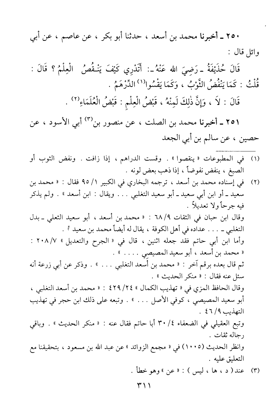 250 - أَخْبَرَنَا مُحَمَّدُ بْنُ أَسْعَدَ، حَدَّثَنَا أَبُو بَكْرٍ، عَنْ عَاصِمٍ، عَنْ أَبِي وَائِلٍ، قَالَ: قَالَ حُذَيْفَةُ رَضِيَ اللَّهُ عَنْهُ: «أَتَدْرِي كَيْفَ يُنْقَصُ الْعِلْمُ؟» قَالَ: قُلْتُ: كَمَا يُنْفَضُ الثَّوْبُ، وَكَمَا يَقْسُو الدِّرْهَمُ. قَالَ: «لَا»، " وَإِنَّ ذَلِكَ لَمِنْهُ، §قَبْضُ الْعِلْمِ: قَبْضُ الْعُلَمَاءِ "Qفي إسناده محمد بن أسعد منكر الحديث