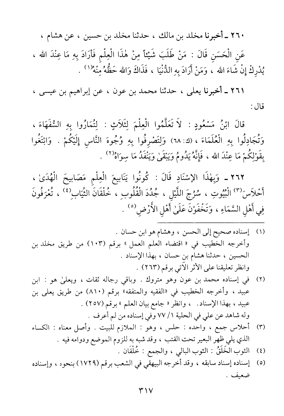 260 - أَخْبَرَنَا مَخْلَدُ بْنُ مَالِكٍ، حَدَّثَنَا مَخْلَدُ بْنُ حُسَيْنٍ، عَنْ هِشَامٍ، عَنِ الْحَسَنِ، قَالَ: «§مَنْ طَلَبَ شَيْئًا مِنْ هَذَا الْعِلْمِ فَأَرَادَ بِهِ مَا عِنْدَ اللَّهِ، يُدْرِكْ إِنْ شَاءَ اللَّهُ، وَمَنْ أَرَادَ بِهِ الدُّنْيَا، فَذَاكَ وَاللَّهِ حَظُّهُ مِنْهُ» Qإسناده صحيح إلى الحسن