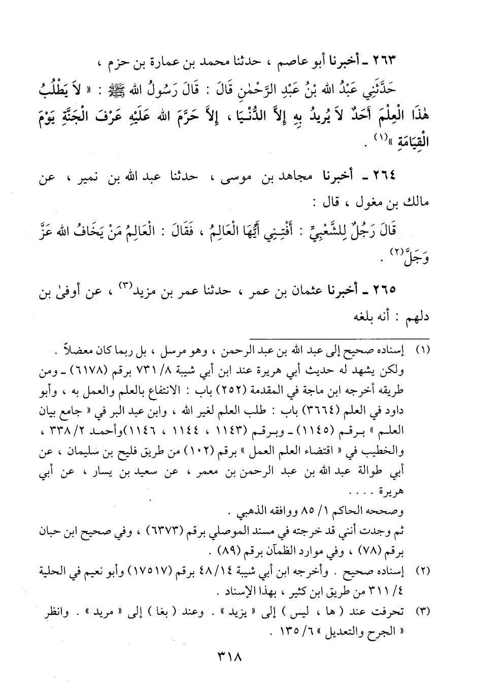 263 - أَخْبَرَنَا أَبُو عَاصِمٍ، حَدَّثَنَا مُحَمَّدُ بْنُ عُمَارَةَ بْنِ حَزْمٍ، حَدَّثَنِي عَبْدُ اللَّهِ بْنُ عَبْدِ الرَّحْمَنِ، قَالَ: قَالَ رَسُولُ اللَّهِ صَلَّى اللهُ عَلَيْهِ وَسَلَّمَ: «§لَا يَطْلُبُ هَذَا الْعِلْمَ أَحَدٌ لَا يُرِيدُ بِهِ إِلَّا الدُّنْيَا، إِلَّا حَرَّمَ اللَّهُ عَلَيْهِ عَرْفَ الْجَنَّةِ يَوْمَ الْقِيَامَةِ» Qإسناده صحيح إلى عبد الله بن عبد الرحمن وهو مرسل بل ربما كان معضلا