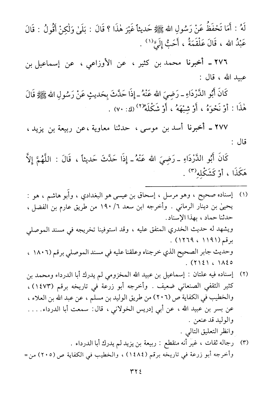 276 - أَخْبَرَنَا مُحَمَّدُ بْنُ كَثِيرٍ، عَنِ الْأَوْزَاعِيِّ، عَنْ إِسْمَاعِيلَ بْنِ عُبَيْدِ اللَّهِ، قَالَ: " كَانَ أَبُو الدَّرْدَاءِ رَضِيَ اللَّهُ عَنْهُ، §إِذَا حَدَّثَ بِحَدِيثٍ عَنْ رَسُولِ اللَّهِ صَلَّى اللهُ عَلَيْهِ وَسَلَّمَ قَالَ: هَذَا: أَوْ نَحْوَهُ، أَوْ شِبْهَهُ، أَوْ شَكْلَهُ "Qإسناده فيه علتان: إسماعيل بن عبيد الله المخزومي لم يدرك أبا الدرداء ومحمد بن كثير الثقفي الصنعاني ضعيف