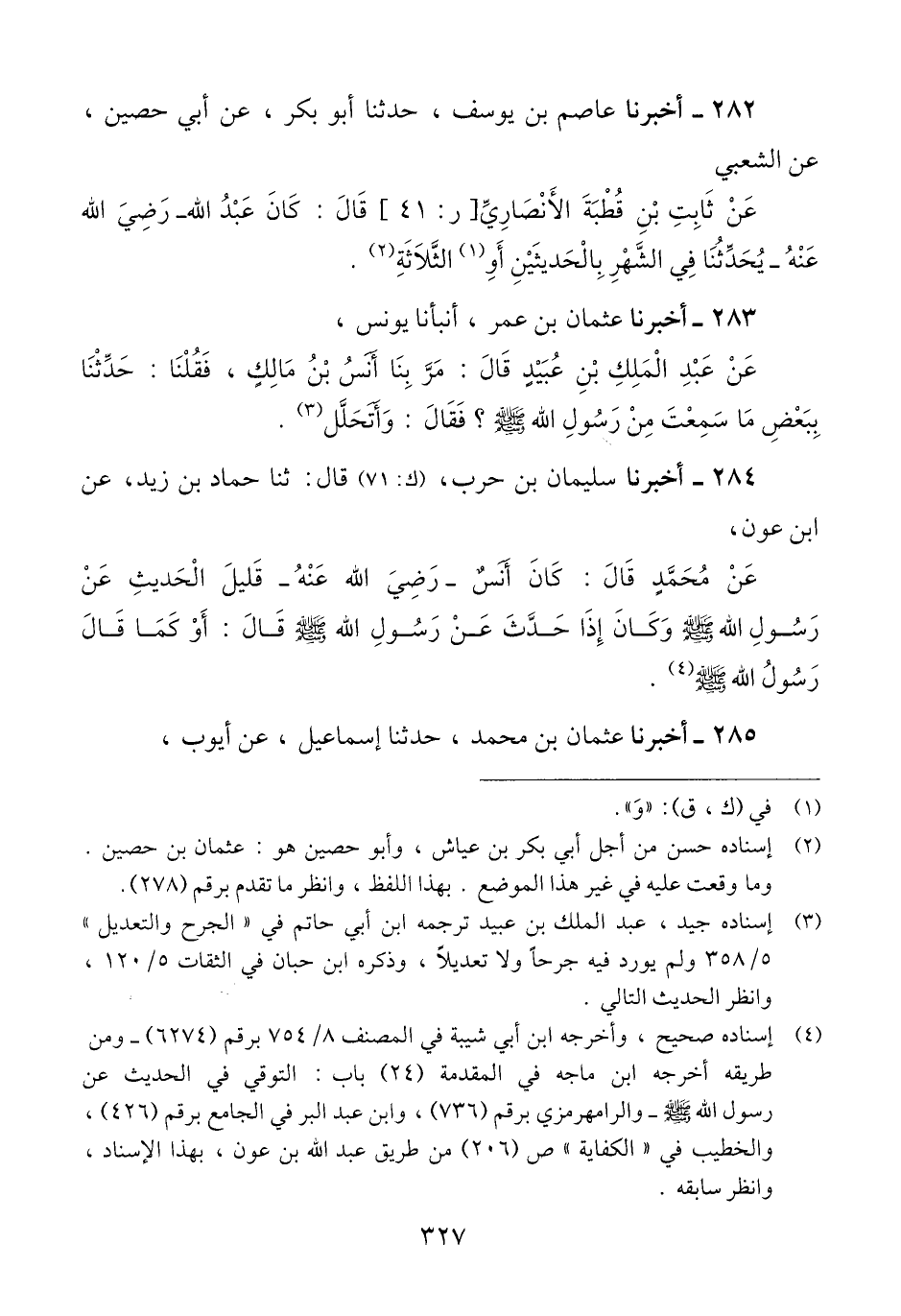 284 - أَخْبَرَنَا سُلَيْمَانُ بْنُ حَرْبٍ، قَالَ: ثَنَا حَمَّادُ بْنُ زَيْدٍ، عَنِ ابْنِ عَوْنٍ، عَنْ مُحَمَّدٍ، قَالَ: كَانَ أَنَسٌ رَضِيَ اللَّهُ عَنْهُ " قَلِيلَ الْحَدِيثِ عَنْ رَسُولِ اللَّهِ صَلَّى اللهُ عَلَيْهِ وَسَلَّمَ وَكَانَ §إِذَا حَدَّثَ عَنْ رَسُولِ اللَّهِ صَلَّى اللهُ عَلَيْهِ وَسَلَّمَ قَالَ: أَوْ كَمَا قَالَ رَسُولُ اللَّهِ صَلَّى اللهُ عَلَيْهِ وَسَلَّمَ "Qإسناده صحيح