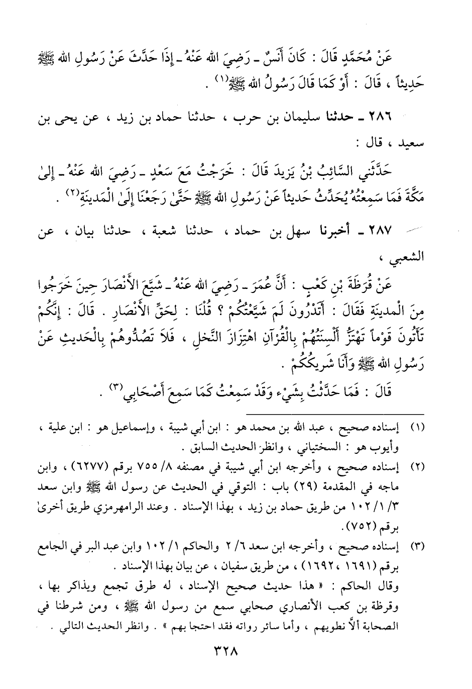 286 - حَدَّثَنَا سُلَيْمَانُ بْنُ حَرْبٍ، حَدَّثَنَا حَمَّادُ بْنُ زَيْدٍ، عَنْ يَحْيَى بْنِ سَعِيدٍ، قَالَ: حَدَّثَنِي السَّائِبُ بْنُ يَزِيدَ، قَالَ: «خَرَجْتُ مَعَ سَعْدٍ رَضِيَ اللَّهُ عَنْهُ إِلَى مَكَّةَ §فَمَا سَمِعْتُهُ يُحَدِّثُ حَدِيثًا عَنْ رَسُولِ اللَّهِ صَلَّى اللهُ عَلَيْهِ وَسَلَّمَ حَتَّى رَجَعْنَا إِلَى الْمَدِينَةِ» Qإسناده صحيح