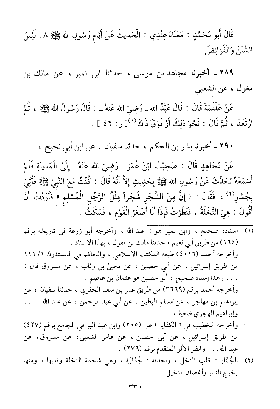 289 - أَخْبَرَنَا مُجَاهِدُ بْنُ مُوسَى، حَدَّثَنَا ابْنُ نُمَيْرٍ، عَنْ مَالِكِ بْنِ مِغْوَلٍ، عَنِ الشَّعْبِيِّ، عَنْ عَلْقَمَةَ، قَالَ: قَالَ: عَبْدُ اللَّهِ رَضِيَ اللَّهُ عَنْهُ، " §قَالَ رَسُولُ اللَّهِ صَلَّى اللهُ عَلَيْهِ وَسَلَّمَ، ثُمَّ ارْتَعَدَ، ثُمَّ قَالَ: نَحْوَ ذَلِكَ أَوْ فَوْقَ ذَاكَ "Qإسناده صحيح