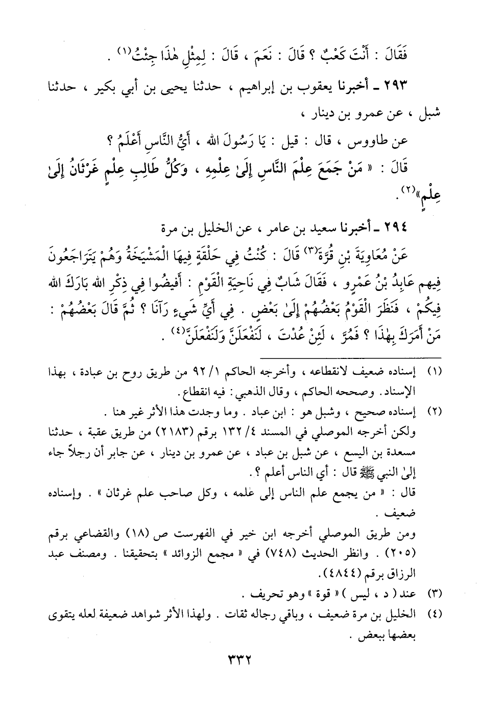 293 - أَخْبَرَنَا يَعْقُوبُ بْنُ إِبْرَاهِيمَ، حَدَّثَنَا يَحْيَى بْنُ أَبِي بُكَيْرٍ، حَدَّثَنَا شِبْلٌ، عَنْ عَمْرِو بْنِ دِينَارٍ، عَنْ طَاوُسٍ، قَالَ: قِيلَ: يَا رَسُولَ اللَّهِ، أَيُّ النَّاسِ أَعْلَمُ؟ قَالَ: «§مَنْ جَمَعَ عِلْمَ النَّاسِ إِلَى عِلْمِهِ، وَكُلُّ طَالِبِ عِلْمٍ غَرْثَانُ إِلَى عِلْمٍ» Qإسناده صحيح
