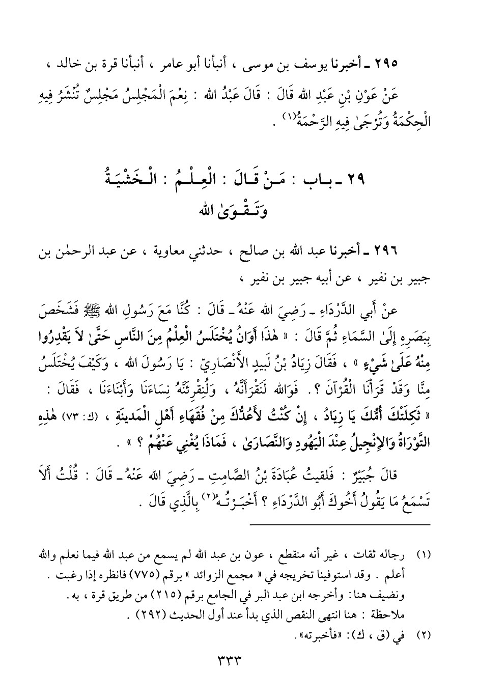 296 - أَخْبَرَنَا عَبْدُ اللَّهِ بْنُ صَالِحٍ، حَدَّثَنِي مُعَاوِيَةُ، عَنْ عَبْدِ الرَّحْمَنِ بْنِ جُبَيْرِ بْنِ نُفَيْرٍ، عَنْ أَبِيهِ جُبْيَرِ بْنِ نُفَيْرٍ، عَنْ أَبِي الدَّرْدَاءِ رَضِيَ اللَّهُ عَنْهُ، قَالَ: كُنَّا مَعَ رَسُولِ اللَّهِ صَلَّى اللَّهِ عَلَيْهِ وَسَلَّمَ فَشَخَصَ بِبَصَرِهِ إِلَى السَّمَاءِ ثُمَّ قَالَ: «§هَذَا أَوَانُ يُخْتَلَسُ الْعِلْمُ مِنَ النَّاسِ حَتَّى لَا يَقْدِرُوا مِنْهُ عَلَى شَيْءٍ» فَقَالَ زِيَادُ بْنُ لَبِيدٍ الْأَنْصَارِيُّ: يَا رَسُولَ اللَّهِ، وَكَيْفَ يُخْتَلَسُ مِنَّا وَقَدْ قَرَأْنَا الْقُرْآنَ؟ فَوَاللَّهِ لَنَقْرَأَنَّهُ، وَلَنُقْرِئَنَّهُ نِسَاءَنَا وَأَبْنَاءَنَا، فَقَالَ: «ثَكِلَتْكَ أُمُّكَ يَا زِيَادُ، إِنْ كُنْتُ لَأَعُدُّكَ مِنْ فُقَهَاءِ أَهْلِ الْمَدِينَةِ، هَذِهِ التَّوْرَاةُ وَالْإِنْجِيلُ عِنْدَ الْيَهُودِ وَالنَّصَارَى، فَمَاذَا يُغْنِي عَنْهُمْ؟» قَالَ جُبَيْرٌ: فَلَقِيتُ عُبَادَةَ بْنَ الصَّامِتِ رَضِيَ اللَّهُ عَنْهُ قَالَ: قُلْتُ أَلَا تَسْمَعُ مَا يَقُولُ أَخُوكَ أَبُو الدَّرْدَاءِ؟ فَأَخْبَرْتُهُ بِالَّذِي قَالَ. -[334]- قَالَ: صَدَقَ أَبُو الدَّرْدَاءِ إِنْ شِئْتَ لَأُحَدِّثَنَّكَ بِأَوَّلِ عِلْمٍ يُرْفَعُ مِنَ النَّاسِ: الْخُشُوعُ، يُوشِكُ أَنْ تَدْخُلَ مَسْجِدَ الْجَمَاعَةِ فَلَا تَرَى فِيهِ رَجُلًا خَاشِعًاQإسناده ضعيف عبد الله بن صالح سيئ الحفظ وفيه غفلة وباقي رجاله ثقات