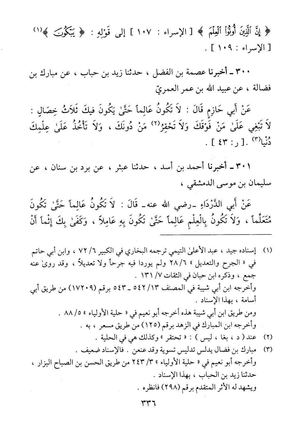 300 - أَخْبَرَنَا عِصْمَةُ بْنُ الْفَضْلِ، حَدَّثَنَا زَيْدُ بْنُ حُبَابٍ، عَنْ مُبَارَكِ بْنِ فَضَالَةَ، عَنْ عُبَيْدِ اللَّهِ بْنِ عُمَرَ الْعُمَرِيِّ، عَنْ أَبِي حَازِمٍ، قَالَ: " §لَا تَكُونُ عَالِمًا حَتَّى يَكُونَ فِيكَ ثَلَاثُ خِصَالٍ: لَا تَبْغِي عَلَى مَنْ فَوْقَكَ وَلَا تَحْقِرُ مَنْ دُونَكَ، وَلَا تَأْخُذُ عَلَى عِلْمِكَ دُنْيَا "Qمبارك بن فضال يدلس تدليس تسوية وقد عنعن. فالإسناد ضعيف