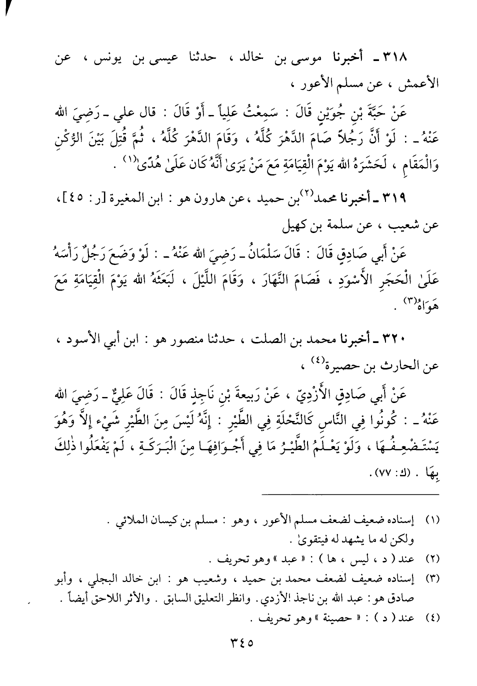 318 - أَخْبَرَنَا مُوسَى بْنُ خَالِدٍ، حَدَّثَنَا عِيسَى بْنُ يُونُسَ، عَنِ الْأَعْمَشِ، عَنْ مُسْلِمٍ الْأَعْوَرِ، عَنْ حَبَّةَ بْنِ جُوَيْنٍ، قَالَ سَمِعْتُ عَلِيًّا أَوْ قَالَ: قَالَ عَلِيٌّ رَضِيَ اللَّهُ عَنْهُ: «§لَوْ أَنَّ رَجُلًا صَامَ الدَّهْرَ كُلَّهُ، وَقَامَ الدَّهْرَ كُلَّهُ، ثُمَّ قُتِلَ بَيْنَ الرُّكْنِ وَالْمَقَامِ، لَحَشَرَهُ اللَّهُ يَوْمَ الْقِيَامَةِ مَعَ مَنْ يُرَى أَنَّهُ كَانَ عَلَى هُدًى»