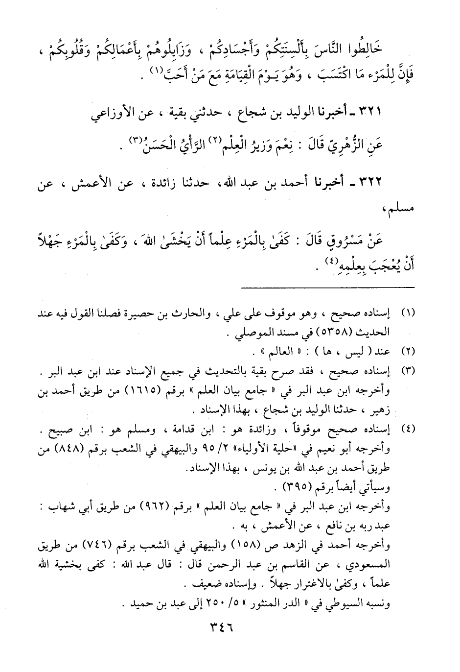 322 - أَخْبَرَنَا أَحْمَدُ بْنُ عَبْدِ اللَّهِ، حَدَّثَنَا زَائِدَةُ، عَنِ الْأَعْمَشِ، عَنْ مُسْلِمٍ، عَنْ مَسْرُوقٍ قَالَ: «§كَفَى بِالْمَرْءِ عِلْمًا أَنْ يَخْشَى اللَّهَ، وَكَفَى بِالْمَرْءِ جَهْلًا أَنْ يُعْجَبَ بِعِلْمِهِ» Qإسناده صحيح موقوفا