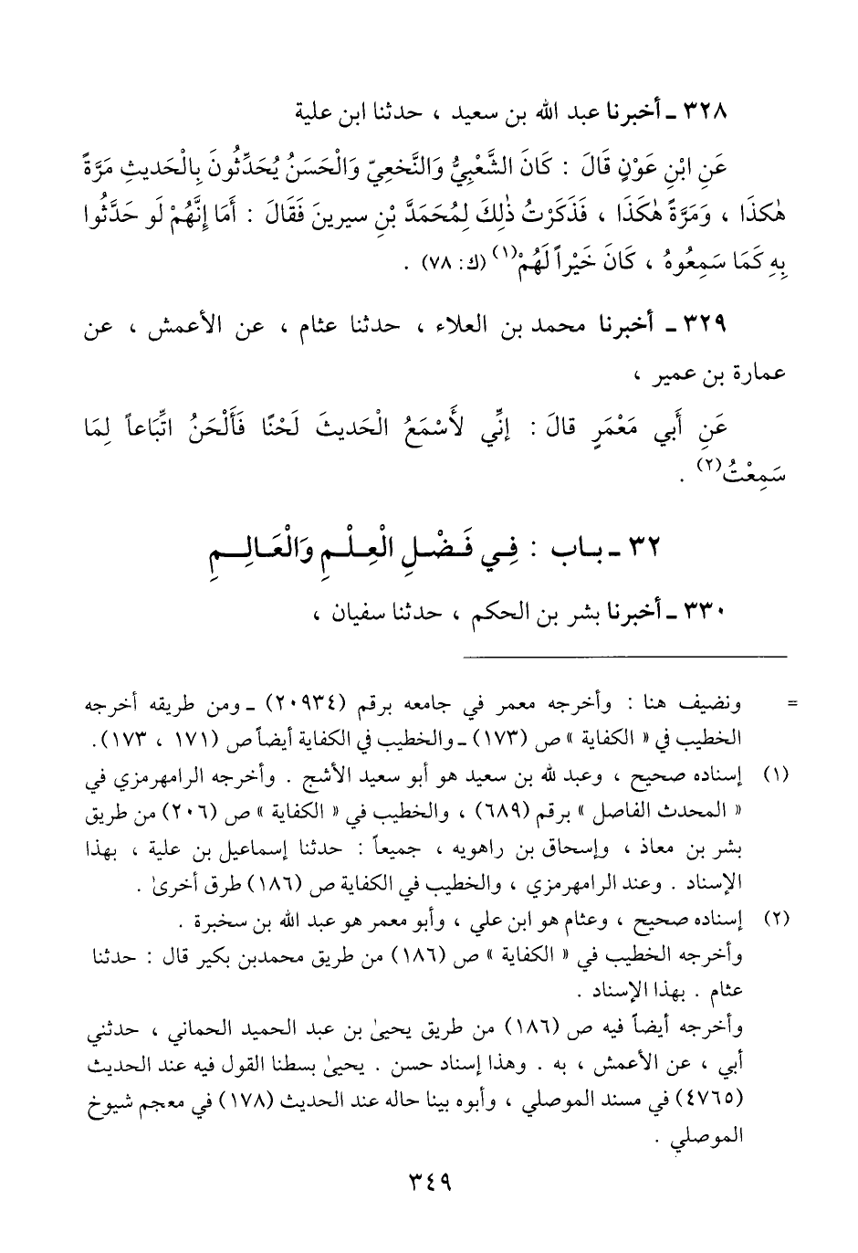 329 - أَخْبَرَنَا مُحَمَّدُ بْنُ الْعَلَاءِ، حَدَّثَنَا عَثَّامٌ، عَنِ الْأَعْمَشِ، عَنْ عُمَارَةَ بْنِ عُمَيْرٍ، عَنْ أَبِي مَعْمَرٍ قَالَ: «§إِنِّي لَأَسْمَعُ الْحَدِيثَ لَحْنًا فَأَلْحَنُ اتِّبَاعًا لِمَا سَمِعْتُ» Qإسناده صحيح