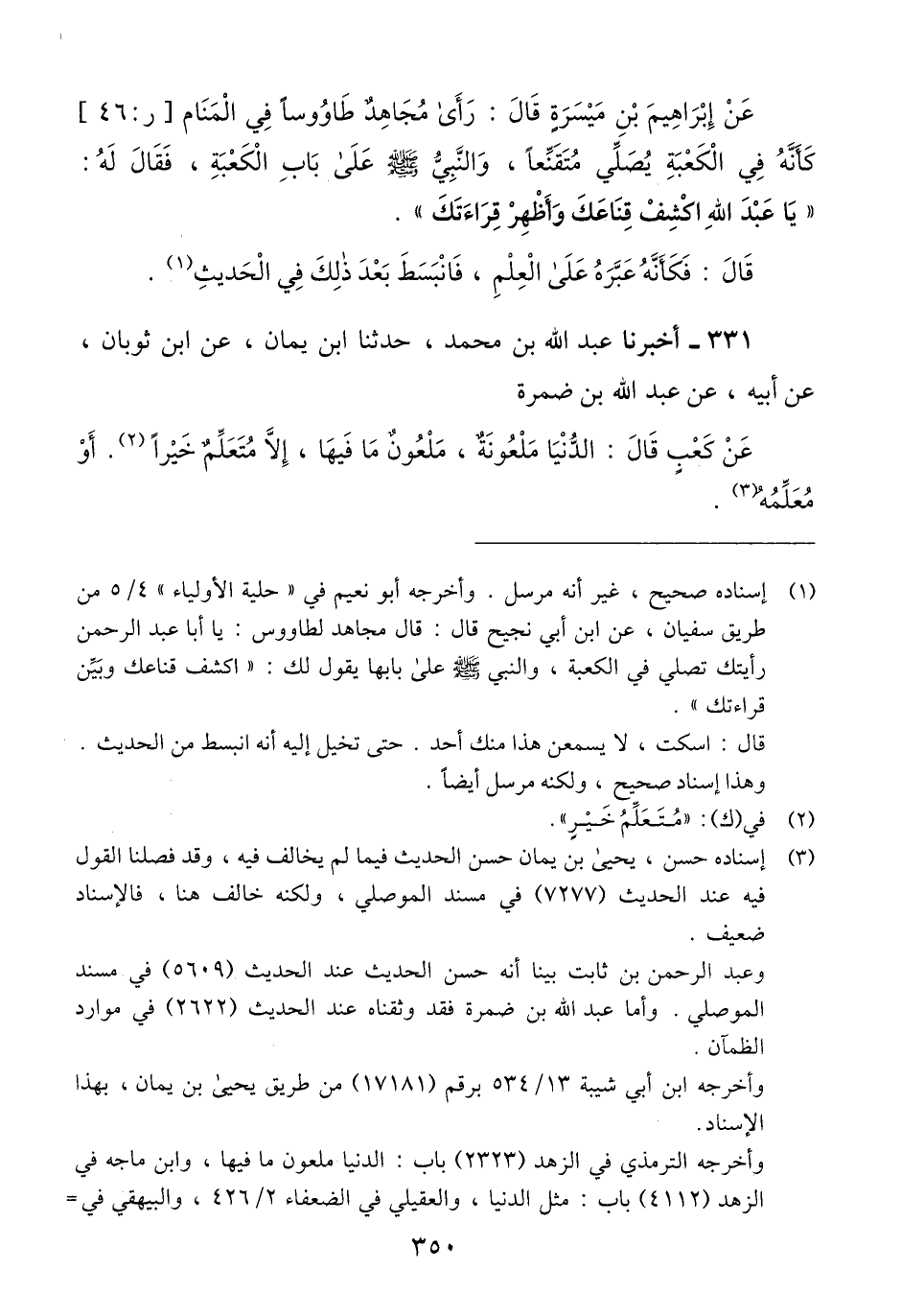 331 - أَخْبَرَنَا عَبْدُ اللَّهِ بْنُ مُحَمَّدٍ، حَدَّثَنَا ابْنُ يَمَانٍ، عَنِ ابْنِ ثَوْبَانَ، عَنْ أَبِيهِ، عَنْ عَبْدِ اللَّهِ بْنِ ضَمْرَةَ، عَنْ كَعْبٍ قَالَ: «§الدُّنْيَا مَلْعُونَةٌ مَلْعُونٌ مَا فِيهَا إِلَّا مُتَعَلِّمَ خَيْرٍ أَوْ مُعَلِّمَهُ» Qإسناده حسن يحيى بن يمان حسن الحديث فيما لم يخالف فيه