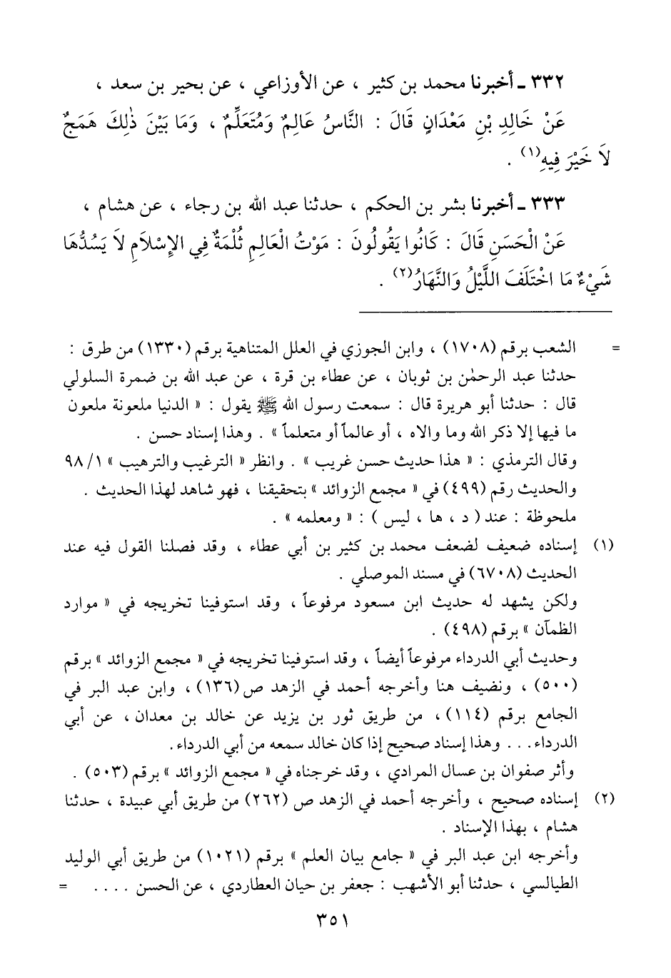 332 - أَخْبَرَنَا مُحَمَّدُ بْنُ كَثِيرٍ، عَنِ الْأَوْزَاعِيِّ، عَنْ بَحِيرِ بْنِ سَعْدٍ، عَنْ خَالِدِ بْنِ مَعْدَانَ، قَالَ: «§النَّاسُ عَالِمٌ وَمُتَعَلِّمٌ، وَمَا بَيْنَ ذَلِكَ هَمَجٌ لَا خَيْرَ فِيهِ» Qإسناده ضعيف لضعف محمد بن كثير بن أبي عطاء