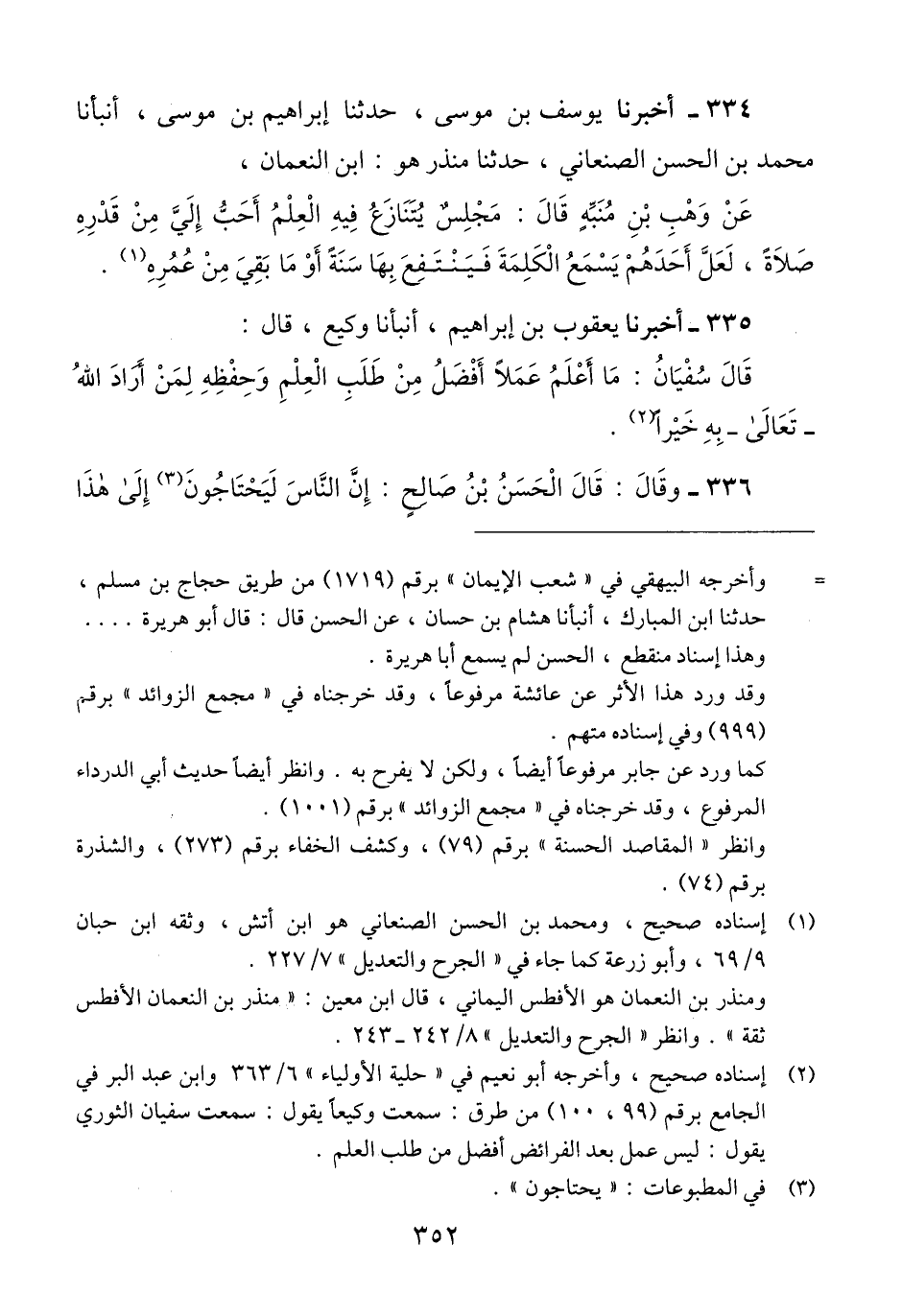 334 - أَخْبَرَنَا يُوسُفُ بْنُ مُوسَى، حَدَّثَنَا إِبْرَاهِيمُ بْنُ مُوسَى، أَنبَأَنَا مُحَمَّدُ بْنُ الْحَسَنِ الصَّنْعَانِيُّ، حَدَّثَنَا مُنْذِرٌ هُوَ ابْنُ النُّعْمَانِ، عَنْ وَهْبِ بْنِ مُنَبِّهٍ، قَالَ: «§مَجْلِسٌ يُتَنَازَعُ فِيهِ الْعِلْمُ أَحَبُّ إِلَيَّ مِنْ قَدْرِهِ صَلَاةً، لَعَلَّ أَحَدَهُمْ يَسْمَعُ الْكَلِمَةَ فَيَنْتَفِعُ بِهَا سَنَةً أَوْ مَا بَقِيَ مِنْ عُمُرِهِ» Qإسناده صحيح