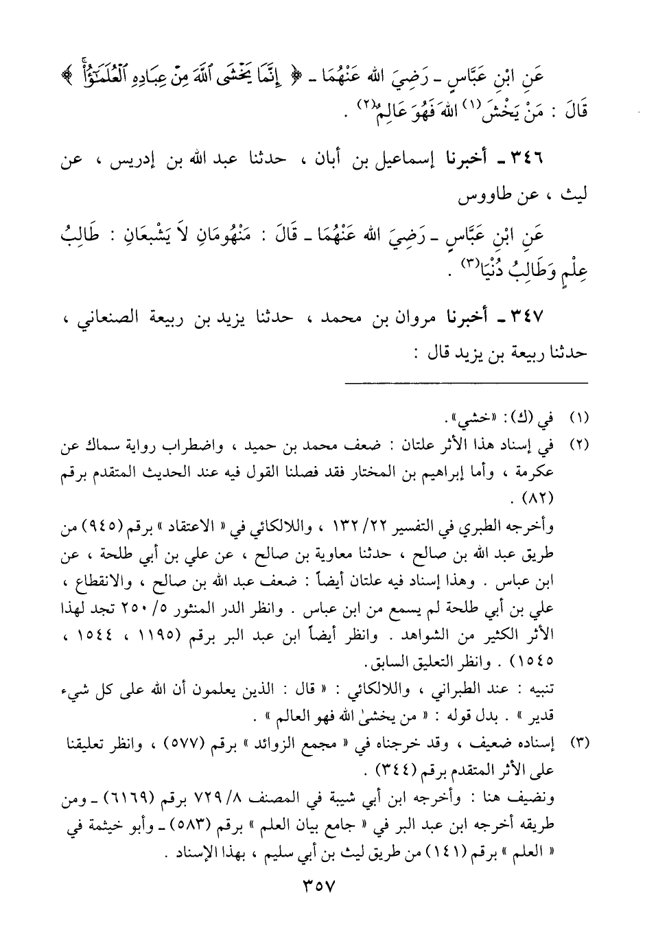346 - أَخْبَرَنَا إِسْمَاعِيلُ بْنُ أَبَانَ، حَدَّثَنَا عَبْدُ اللَّهِ بْنُ إِدْرِيسَ، عَنْ لَيْثٍ، عَنْ طَاوُسٍ، عَنِ ابْنِ عَبَّاسٍ رَضِيَ اللَّهُ عَنْهُمَا، قَالَ: " §مَنْهُومَانِ لَا يَشْبَعَانِ: طَالِبُ عِلْمٍ، وَطَالِبُ دُنْيَا "Qإسناده ضعيف