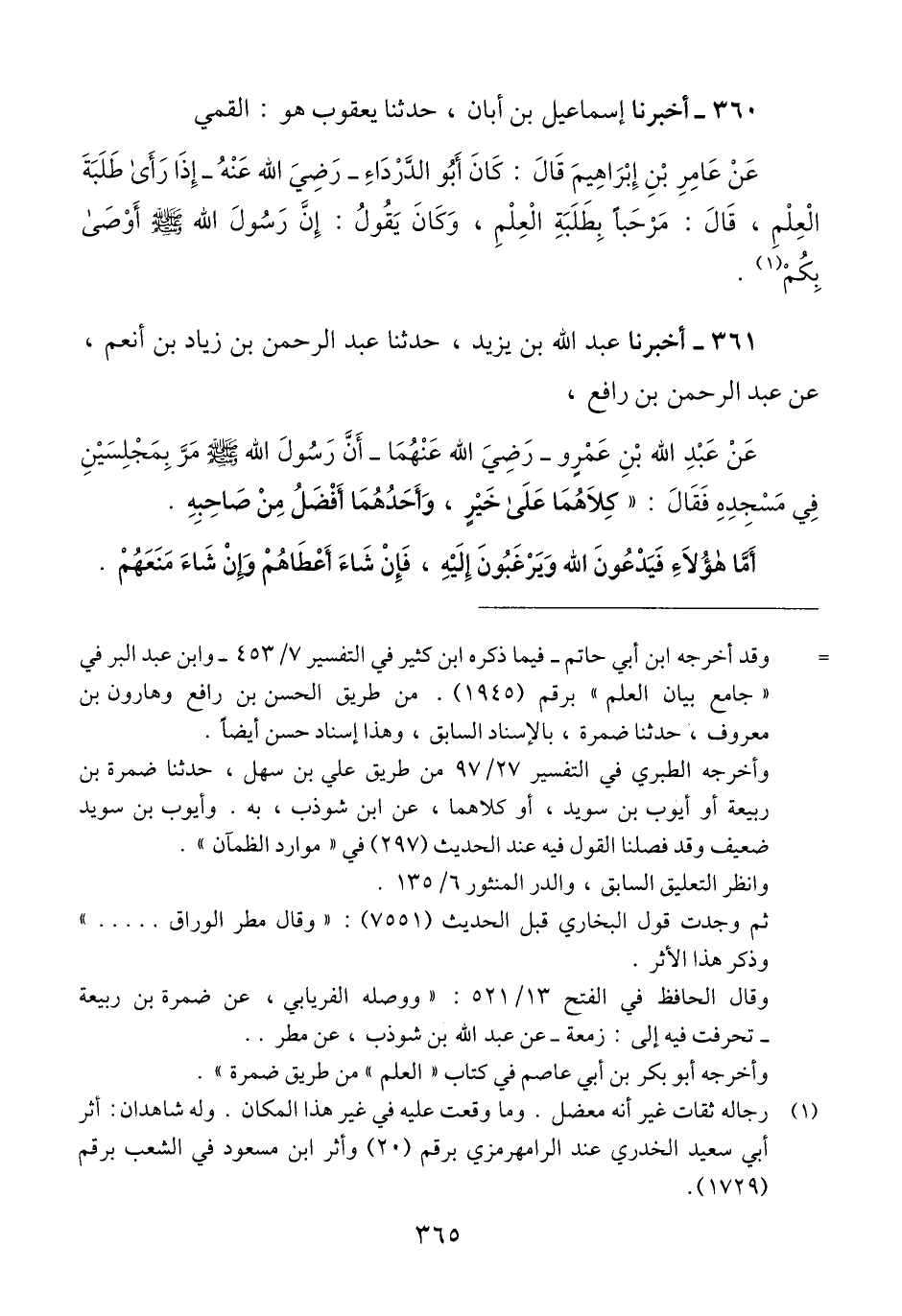 360 - أَخْبَرَنَا إِسْمَاعِيلُ بْنُ أَبَانَ، حَدَّثَنَا يَعْقُوبُ هُوَ الْقُمِّيُّ، عَنْ عَامِرِ بْنِ إِبْرَاهِيمَ، قَالَ: كَانَ أَبُو الدَّرْدَاءِ رَضِيَ اللَّهُ عَنْهُ، إِذَا رَأَى طَلَبَةَ الْعِلْمِ، قَالَ: " §مَرْحَبًا بِطَلَبَةِ الْعِلْمِ، وَكَانَ يَقُولُ: إِنَّ رَسُولَ اللَّهِ صَلَّى اللهُ عَلَيْهِ وَسَلَّمَ أَوْصَى بِكُمْ "Qرجاله ثقات غير أنه معضل
