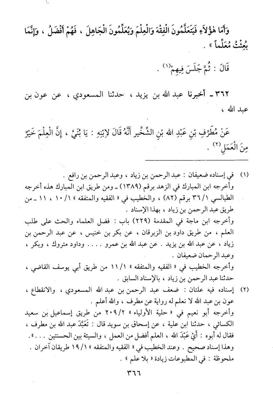 362 - أَخْبَرَنَا عَبْدُ اللَّهِ بْنُ يَزِيدَ، حَدَّثَنَا الْمَسْعُودِيُّ، عَنْ عَوْنِ بْنِ عَبْدِ اللَّهِ، عَنْ مُطَرِّفِ بْنِ عَبْدِ اللَّهِ بْنِ الشِّخِّيرِ، أَنَّهُ قَالَ لِابْنِهِ: يَا بُنَيَّ، إِنَّ «§الْعِلْمَ خَيْرٌ مِنَ الْعَمَلِ» Qإسناده فيه علتان: ضعف عبد الرحمن بن عبد الله المسعودي والانقطاع عون بن عبد الله لا نعلم له رواية عن مطرف