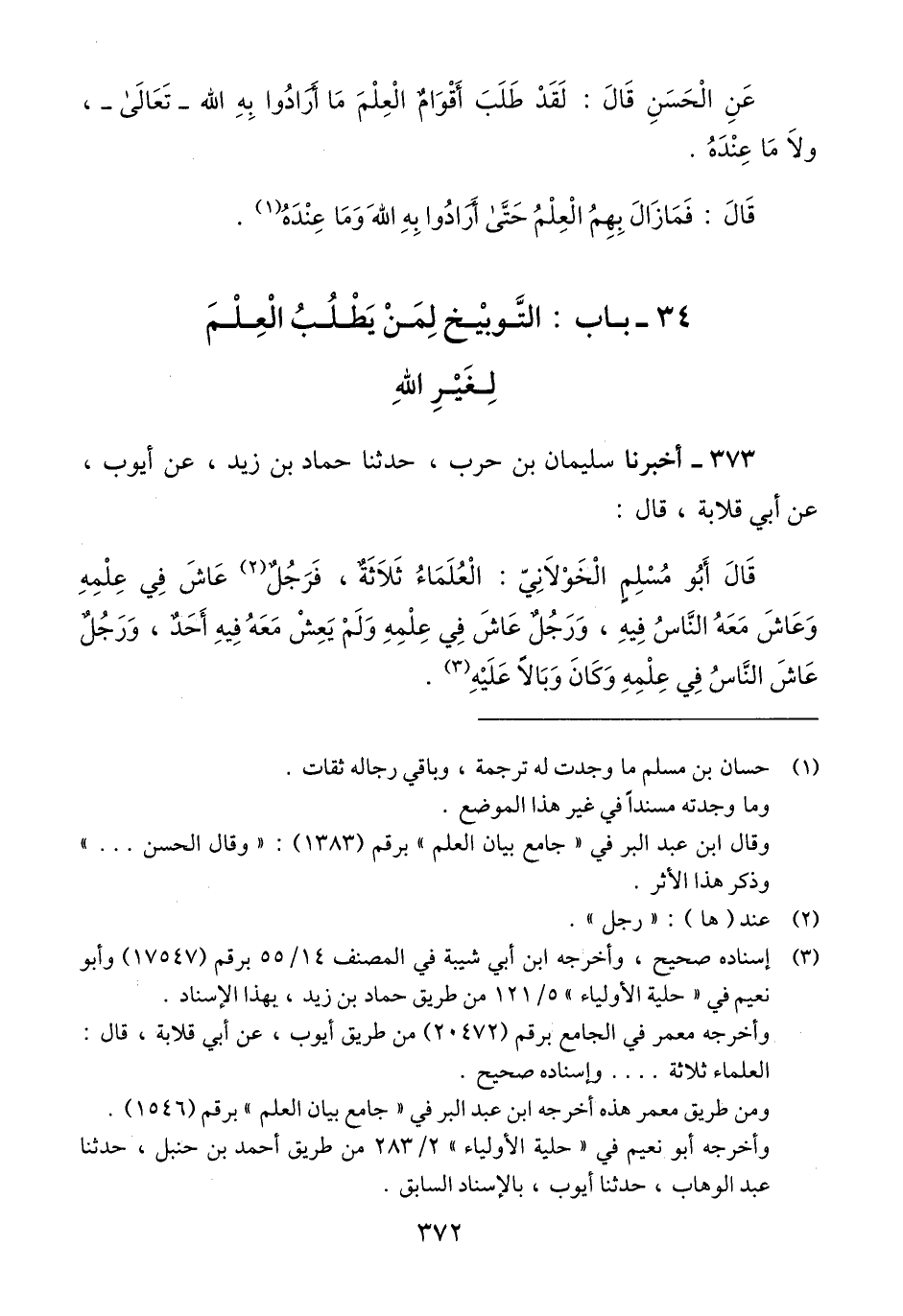 373 - أَخْبَرَنَا سُلَيْمَانُ بْنُ حَرْبٍ، حَدَّثَنَا حَمَّادُ بْنُ زَيْدٍ، عَنْ أَيُّوبَ، عَنْ أَبِي قِلَابَةَ قَالَ: قَالَ أَبُو مُسْلِمٍ الْخَوْلَانِيُّ،: «§الْعُلَمَاءُ ثَلَاثَةٌ، فَرَجُلٌ عَاشَ فِي عِلْمِهِ، وَعَاشَ مَعَهُ النَّاسُ فِيهِ، وَرَجُلٌ عَاشَ فِي عِلْمِهِ، وَلَمْ يَعِشْ مَعَهُ فِيهِ أَحَدٌ، وَرَجُلٌ عَاشَ النَّاسُ فِي عِلْمِهِ، وَكَانَ وَبَالًا عَلَيْهِ» Qإسناده صحيح