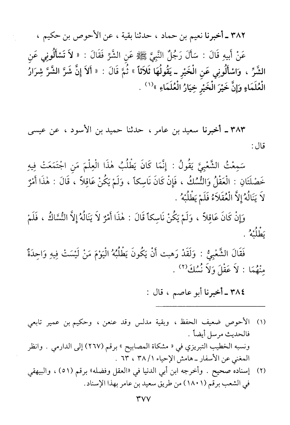383 - أَخْبَرَنَا سَعِيدُ بْنُ عَامِرٍ، حَدَّثَنَا حُمَيْدُ بْنُ الْأَسْوَدِ، عَنْ عِيسَى، قَالَ: سَمِعْتُ الشَّعْبِيَّ، يَقُولُ: " §إِنَّمَا كَانَ يَطْلُبُ هَذَا الْعِلْمَ مَنِ اجْتَمَعَتْ فِيهِ خَصْلَتَانِ: الْعَقْلُ وَالنُّسُكُ، فَإِنْ كَانَ نَاسِكًا، وَلَمْ يَكُنْ عَاقِلًا، قَالَ: هَذَا أَمْرٌ لَا يَنَالُهُ إِلَّا الْعُقَلَاءُ فَلَمْ يَطْلُبْهُ. وَإِنْ كَانَ عَاقِلًا، وَلَمْ يَكُنْ نَاسِكًا قَالَ: هَذَا أَمْرٌ لَا يَنَالُهُ إِلَّا النُّسَّاكُ، فَلَمْ يَطْلُبْهُ. فَقَالَ: الشَّعْبِيُّ وَلَقَدْ رَهِبْتُ أَنْ يَكُونَ يَطْلُبُهُ الْيَوْمَ مَنْ لَيْسَتْ فِيهِ وَاحِدَةٌ مِنْهُمَا: لَا عَقْلٌ وَلَا نُسُكٌ: "Qإسناده صحيح