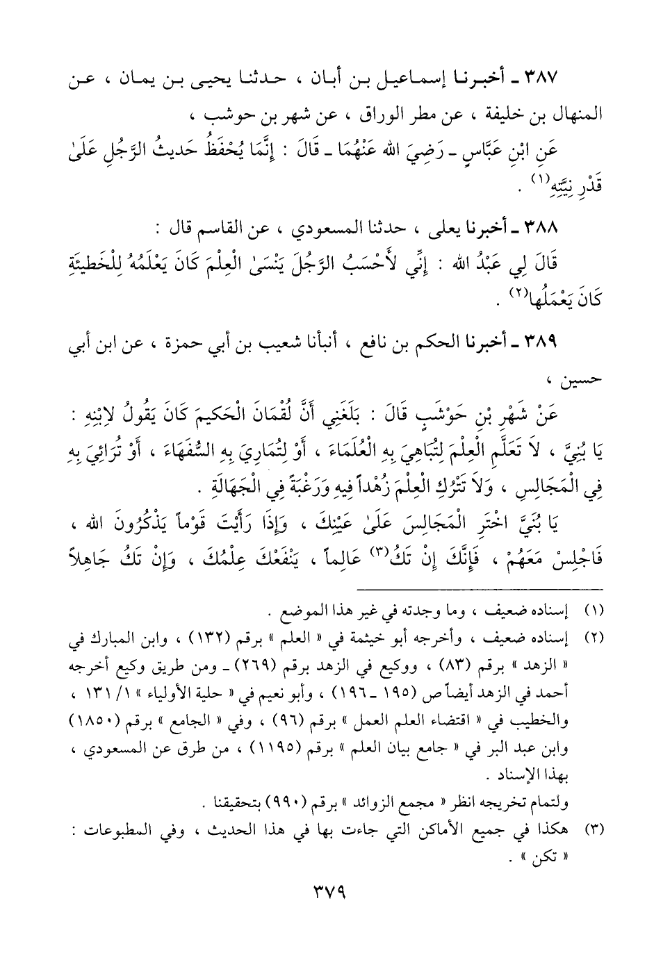 389 - أَخْبَرَنَا الْحَكَمُ بْنُ نَافِعٍ، أَخْبَرَنَا شُعَيْبُ بْنُ أَبِي حَمْزَةَ، عَنِ ابْنِ أَبِي حُسَيْنٍ، عَنْ شَهْرِ بْنِ حَوْشَبٍ، قَالَ: بَلَغَنِي أَنَّ لُقْمَانَ الْحَكِيمَ كَانَ يَقُولُ لِابْنِهِ: «يَا بُنَيَّ، §لَا تَعَلَّمِ الْعِلْمَ لِتُبَاهِيَ بِهِ الْعُلَمَاءَ، أَوْ لِتُمَارِيَ بِهِ السُّفَهَاءَ، أَوْ تُرَائِيَ بِهِ فِي الْمَجَالِسِ، وَلَا تَتْرُكِ الْعِلْمَ زُهْدًا فِيهِ، وَرَغْبَةً فِي الْجَهَالَةِ. يَا بُنَيَّ اخْتَرِ الْمَجَالِسَ عَلَى عَيْنِكَ، وَإِذَا رَأَيْتَ قَوْمًا يَذْكُرُونَ اللَّهَ، فَاجْلِسْ مَعَهُمْ، فَإِنَّكَ إِنْ تَكُنْ عَالِمًا، يَنْفَعْكَ عِلْمُكَ، وَإِنْ تَكُنْ جَاهِلًا، -[380]- يُعَلِّمُوكَ، وَلَعَلَّ اللَّهَ أَنْ يَطَّلِعَ عَلَيْهِمْ بِرَحْمَتِهِ، فَيُصِيبَكَ بِهَا مَعَهُمْ، وَإِذَا رَأَيْتَ قَوْمًا، لَا يَذْكُرُونَ اللَّهَ، فَلَا تَجْلِسْ مَعَهُمْ، فَإِنَّكَ إِنْ تَكُنْ عَالِمًا، لَا يَنْفَعْكَ عِلْمُكَ، وَإِنْ تَكُنْ جَاهِلًا، زَادُوكَ غَيًّا، وَلَعَلَّ اللَّهَ أَنْ يَطَّلِعَ عَلَيْهِمْ بِعَذَابٍ فَيُصِيبَكَ مَعَهُمْ» Qإسناده حسن إلى شهر بن حوشب