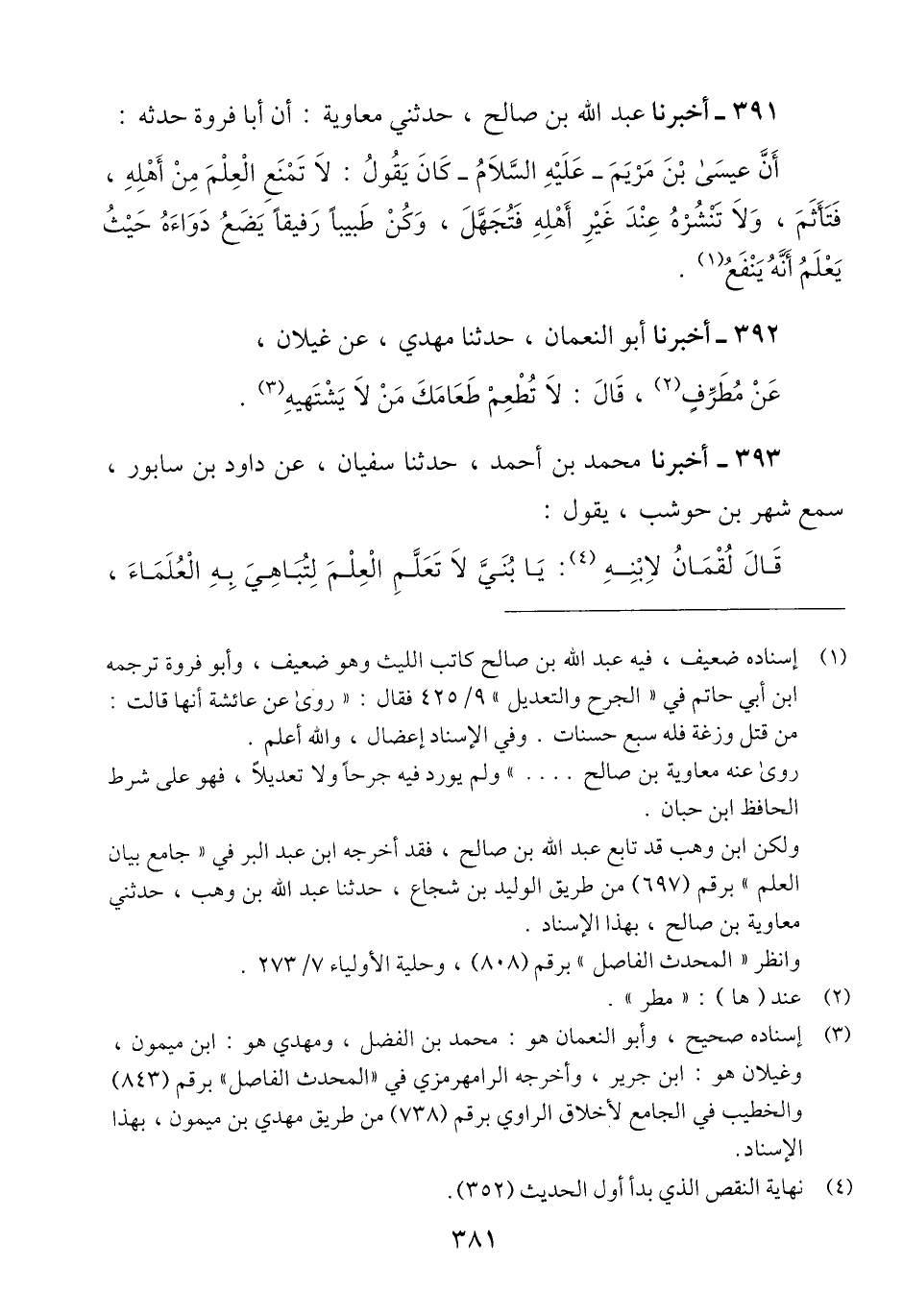 391 - أَخْبَرَنَا عَبْدُ اللَّهِ بْنُ صَالِحٍ، حَدَّثَنِي مُعَاوِيَةُ، أَنَّ أَبَا فَرْوَةَ، حَدَّثَهُ: أَنَّ عِيسَى ابْنَ مَرْيَمَ عَلَيْهِ السَّلَامُ كَانَ يَقُولُ: «§لَا تَمْنَعِ الْعِلْمَ مِنْ أَهْلِهِ، فَتَأْثَمَ، وَلَا تَنْشُرْهُ عِنْدَ غَيْرِ أَهْلِهِ فَتُجَهَّلَ، وَكُنْ طَبِيبًا رَفِيقًا، يَضَعُ دَوَاءَهُ حَيْثُ يَعْلَمُ أَنَّهُ يَنْفَعُ» Qإسناده ضعيف فيه عبد الله بن صالح كاتب الليث وهو ضعيف وفي الإسناد إعضال