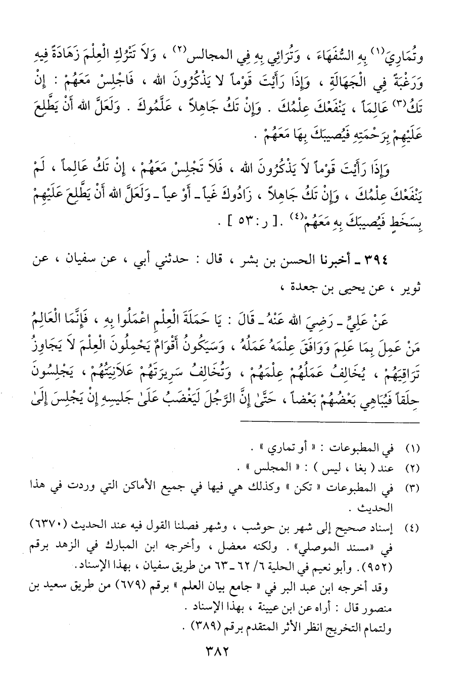 394 - أَخْبَرَنَا الْحَسَنُ بْنُ بِشْرٍ، قَالَ: حَدَّثَنِي أَبِي، عَنْ سُفْيَانَ، عَنْ ثُوَيْرٍ، عَنْ يَحْيَى بْنِ جَعْدَةَ، عَنْ عَلِيٍّ رَضِيَ اللَّهُ عَنْهُ، قَالَ: «يَا حَمَلَةَ الْعِلْمِ اعْمَلُوا بِهِ، فَإِنَّمَا §الْعَالِمُ مَنْ عَمِلَ بِمَا عَلِمَ وَوَافَقَ عِلْمُهُ عَمَلَهُ، وَسَيَكُونُ أَقْوَامٌ يَحْمِلُونَ الْعِلْمَ لَا يُجَاوِزُ تَرَاقِيَهُمْ، يُخَالِفُ عَمَلُهُمْ عِلْمَهُمْ، وَتُخَالِفُ سَرِيرَتُهُمْ عَلَانِيَتَهُمْ، يَجْلِسُونَ حِلَقًا فَيُبَاهِيَ بَعْضُهُمْ بَعْضًا، حَتَّى إِنَّ الرَّجُلَ لَيَغْضَبُ عَلَى جَلِيسِهِ أَنْ يَجْلِسَ إِلَى -[383]- غَيْرِهِ وَيَدَعَهُ، أُولَئِكَ لَا تَصْعَدُ أَعْمَالُهُمْ فِي مَجَالِسِهِمْ، تِلْكَ إِلَى اللَّهِ تَعَالَى» Qبشر بن سلم منكر الحديث وثوير بن أبي فاخته ضعيف ويحيى بن جعدة ما عرفنا له رواية عن علي فيما نعلم