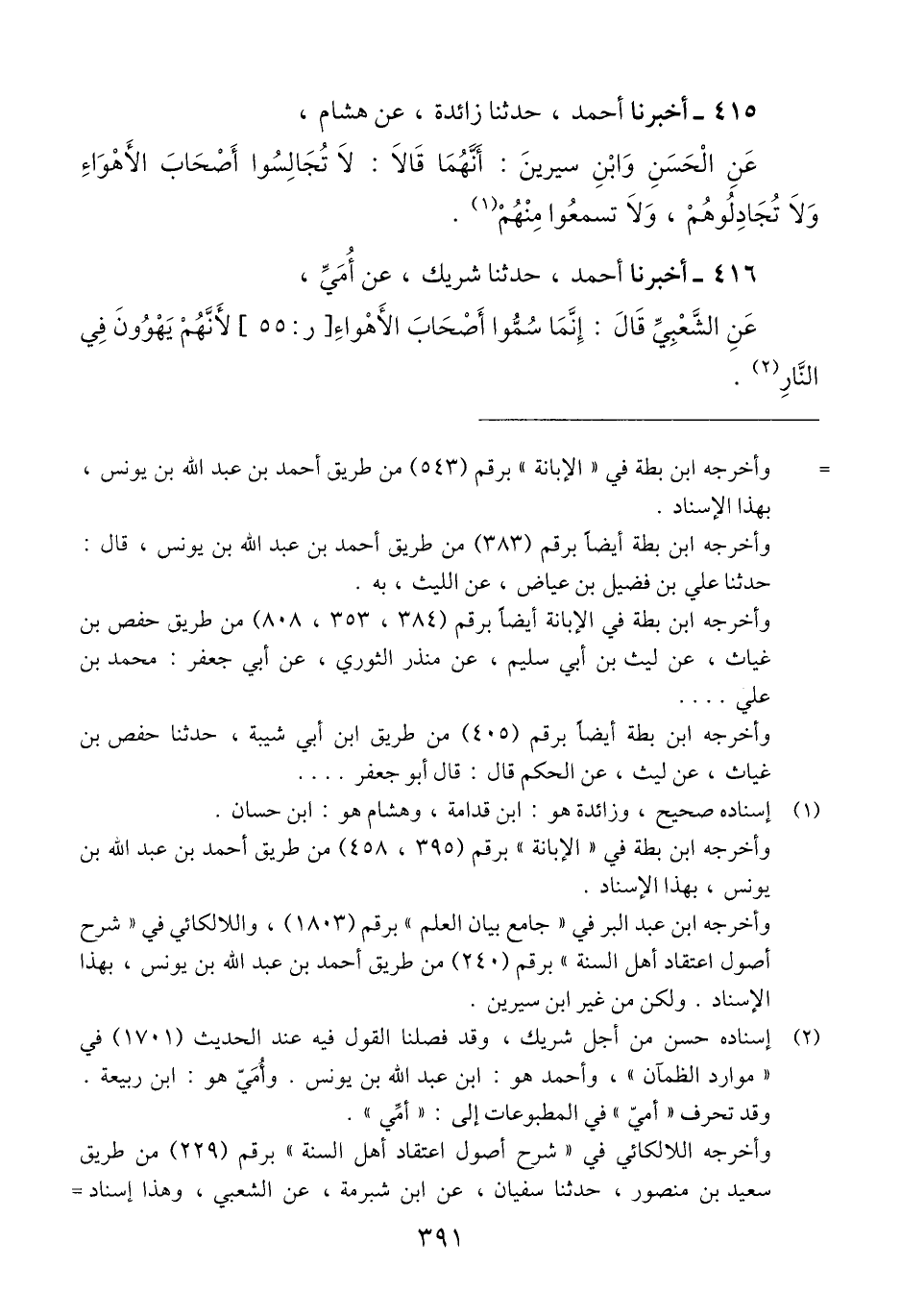 415 - أَخْبَرَنَا أَحْمَدُ، حَدَّثَنَا زَائِدَةُ، عَنْ هِشَامٍ، عَنِ الْحَسَنِ وَابْنِ سِيرِينَ: أَنَّهُمَا قَالَا: «§لَا تُجَالِسُوا أَصْحَابَ الْأَهْوَاءِ، وَلَا تُجَادِلُوهُمْ، وَلَا تَسْمَعُوا مِنْهُمْ» Qإسناده صحيح