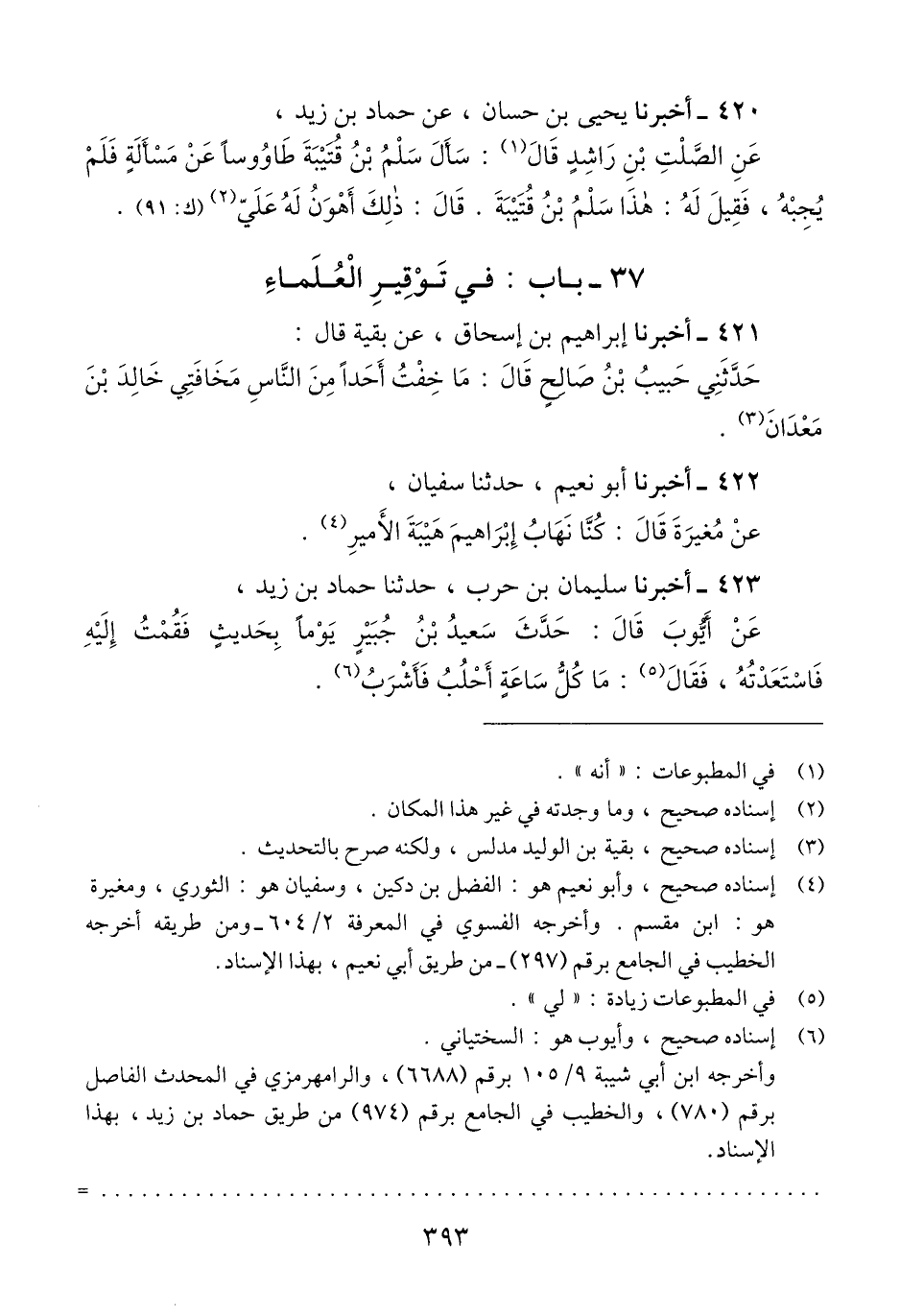 423 - أَخْبَرَنَا سُلَيْمَانُ بْنُ حَرْبٍ، حَدَّثَنَا حَمَّادُ بْنُ زَيْدٍ، عَنْ أَيُّوبَ، قَالَ: " حَدَّثَ سَعِيدُ بْنُ جُبَيْرٍ، يَوْمًا بِحَدِيثٍ، فَقُمْتُ إِلَيْهِ فَاسْتَعَدْتُهُ، فَقَالَ: §مَا كُلَّ سَاعَةٍ أَحْلُبُ فَأُشْرَبُ "Qإسناده صحيح