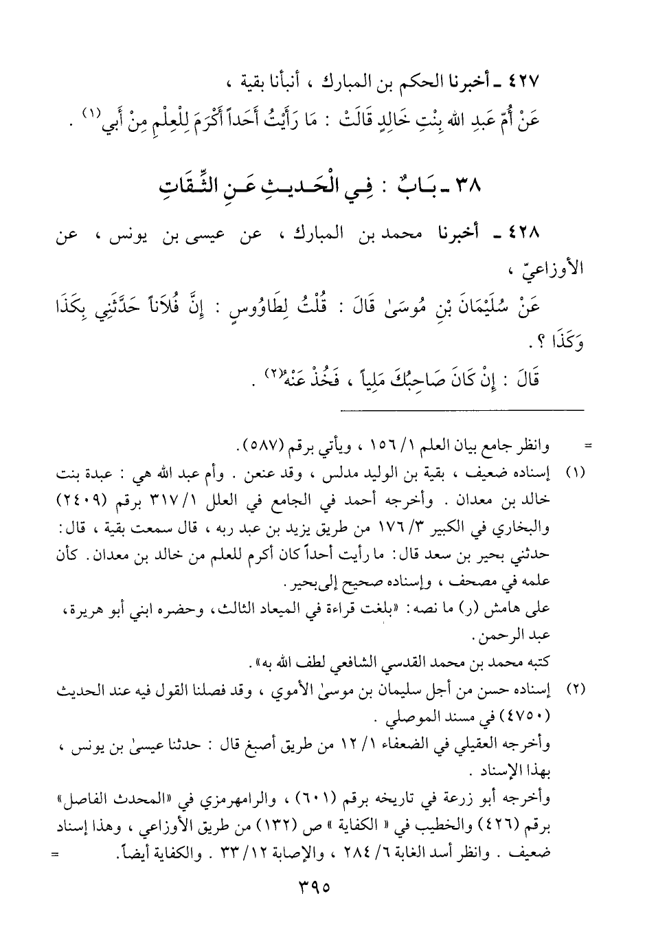 428 - أَخْبَرَنَا مُحَمَّدُ بْنُ الْمُبَارَكِ، عَنْ عِيسَى بْنِ يُونُسَ، عَنِ الْأَوْزَاعِيِّ، عَنْ سُلَيْمَانَ بْنِ مُوسَى، قَالَ: قُلْتُ لِطَاوُسٍ: إِنَّ فُلَانًا حَدَّثَنِي بِكَذَا وَكَذَا: قَالَ «§إِنْ كَانَ صَاحِبُكَ مَلِيًّا، فَخُذْ عَنْهُ» Qإسناده حسن من أجل سليمان بن موسى الأموي