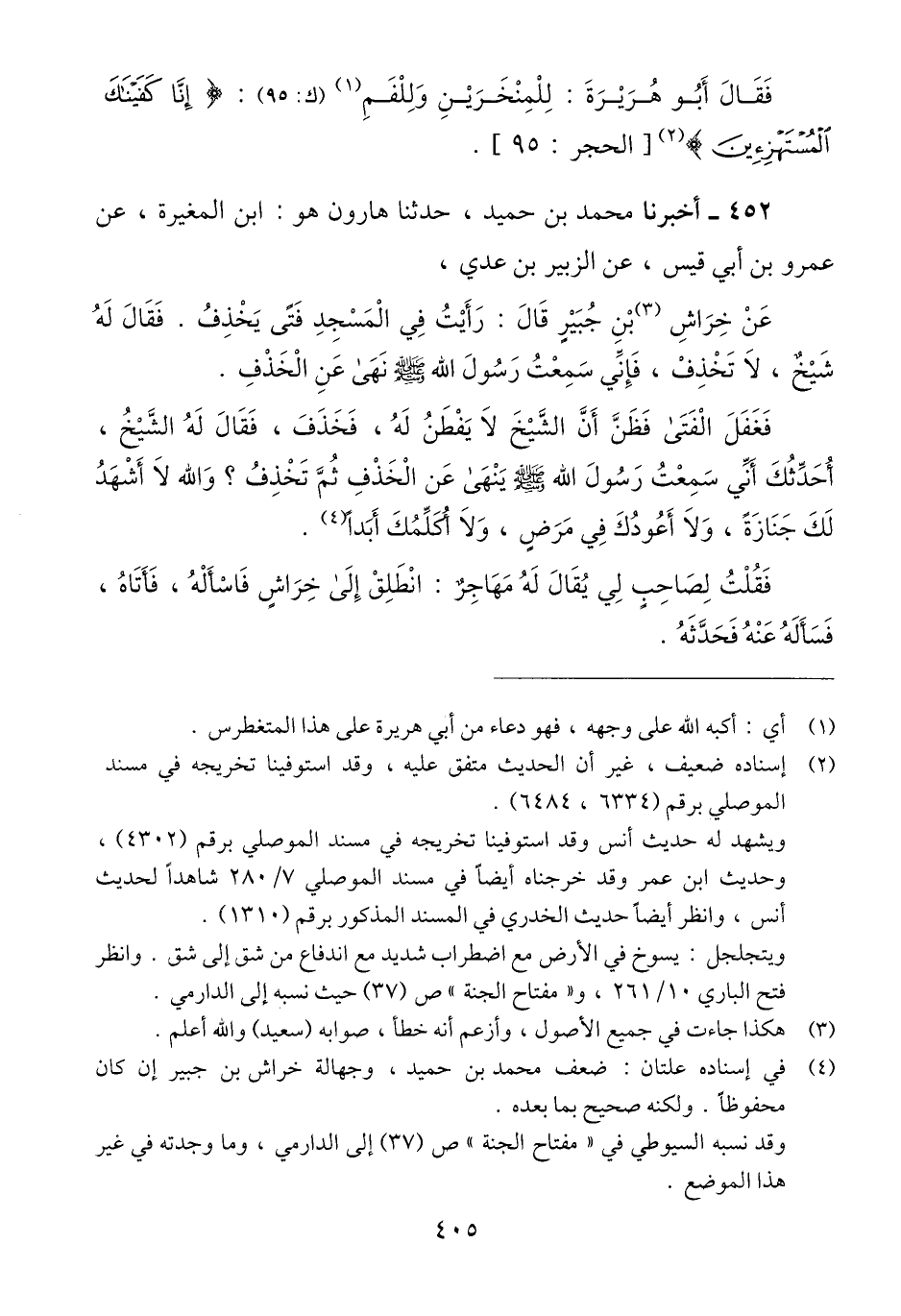 452 - أَخْبَرَنَا مُحَمَّدُ بْنُ حُمَيْدٍ، حَدَّثَنَا هَارُونُ هُوَ ابْنُ الْمُغِيرَةِ، عَنْ عَمْرِو بْنِ أَبِي قَيْسٍ، عَنِ الزُّبَيْرِ بْنِ عَدِيٍّ، عَنْ خِرَاشِ بْنِ جُبَيْرٍ، قَالَ: رَأَيْتُ فِي الْمَسْجِدِ فَتًى يَخْذِفُ. فَقَالَ لَهُ شَيْخٌ، لَا تَخْذِفْ، «فَإِنِّي سَمِعْتُ رَسُولَ اللَّهِ صَلَّى اللهُ عَلَيْهِ وَسَلَّمَ §نَهَى عَنِ الْخَذْفِ» فَغَفَلَ الْفَتَى، وَظَنَّ أَنَّ الشَّيْخَ لَا يَفْطِنُ لَهُ، فَخَذَفَ، فَقَالَ لَهُ الشَّيْخُ، أُحَدِّثُكَ أَنِّي سَمِعْتُ رَسُولَ اللَّهِ صَلَّى اللهُ عَلَيْهِ وَسَلَّمَ يَنْهَى عَنِ الْخَذْفِ ثُمَّ تَخْذِفُ؟ وَاللَّهِ لَا أَشْهَدُ لَكَ جَنَازَةً، وَلَا أَعُودُكَ فِي مَرَضٍ، وَلَا أُكَلِّمُكَ أَبَدًا. فَقُلْتُ لِصَاحِبٍ لِي يُقَالُ لَهُ مُهَاجِرٌ: انْطَلِقْ إِلَى خِرَاشٍ فَاسْأَلْهُ، فَأَتَاهُ، فَسَأَلَهُ عَنْهُ فَحَدَّثَهُQفي إسناده علتان: ضعف محمد بن حميد وجهالة خراش بن جبير إن كان محفوظا. ولكنه صحيح بما بعده
