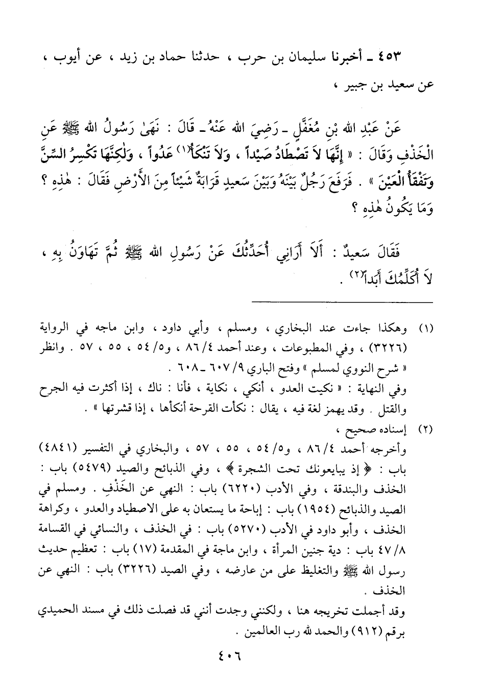 453 - أَخْبَرَنَا سُلَيْمَانُ بْنُ حَرْبٍ، حَدَّثَنَا حَمَّادُ بْنُ زَيْدٍ، عَنْ أَيُّوبَ، عَنْ سَعِيدِ بْنِ جُبَيْرٍ، عَنْ عَبْدِ اللَّهِ بْنِ مُغَفَّلٍ رَضِيَ اللَّهُ عَنْهُ، قَالَ: §نَهَى رَسُولُ اللَّهِ صَلَّى اللهُ عَلَيْهِ وَسَلَّمَ عَنِ الْخَذْفِ، وَقَالَ: «إِنَّهَا لَا تَصْطَادُ صَيْدًا، وَلَا تَنْكَأُ، عَدُوًّا، وَلَكِنَّهَا تَكْسِرُ السِّنَّ وَتَفْقَأُ الْعَيْنَ». فَرَفَعَ رَجُلٌ بَيْنَهُ وَبَيْنَ سَعِيدٍ قَرَابَةٌ شَيْئًا مِنَ الْأَرْضِ فَقَالَ: هَذِهِ؟ وَمَا تَكُونُ هَذِهِ؟ فَقَالَ سَعِيدٌ: أَلَا أُرَانِي أُحَدِّثُكَ عَنْ رَسُولِ اللَّهِ صَلَّى اللهُ عَلَيْهِ وَسَلَّمَ، ثُمَّ تَهَاوَنُ بِهِ، لَا أُكَلِّمُكَ أَبَدًاQوهكذا جاءت عند البخاري ومسلم إسناده صحيح