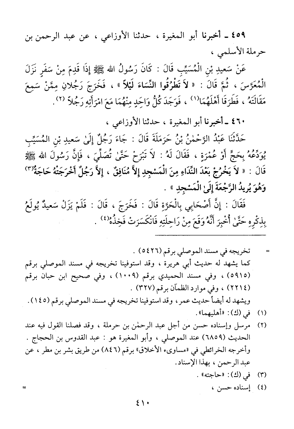 460 - أَخْبَرَنَا أَبُو الْمُغِيرَةِ، حَدَّثَنَا الْأَوْزَاعِيُّ، حَدَّثَنَا عَبْدُ الرَّحْمَنِ بْنُ حَرْمَلَةَ، قَالَ: جَاءَ رَجُلٌ إِلَى سَعِيدِ بْنِ الْمُسَيِّبِ يُوَدِّعُهُ بِحَجٍّ أَوْ عُمْرَةٍ فَقَالَ لَهُ: لَا تَبْرَحْ حَتَّى تُصَلِّيَ، فَإِنَّ رَسُولَ اللَّهِ صَلَّى اللهُ عَلَيْهِ وَسَلَّمَ قَالَ: «§لَا يَخْرُجُ بَعْدَ النِّدَاءِ مِنَ الْمَسْجِدِ إِلَّا، مُنَافِقٌ، إِلَّا رَجُلٌ أَخْرَجَتْهُ حاجةُ، وَهُوَ يُرِيدُ الرَّجْعَةَ إِلَى الْمَسْجِدِ» فَقَالَ: إِنَّ أَصْحَابِي بِالْحَرَّةِ قَالَ: فَخَرَجَ، قَالَ: فَلَمْ يَزَلْ سَعِيدٌ يَوْلَعُ بِذِكْرِهِ، حَتَّى أُخْبِرَ أَنَّهُ وَقَعَ مِنْ رَاحِلَتِهِ فَانْكَسَرَتْ فَخِذُهُQإسناده حسن