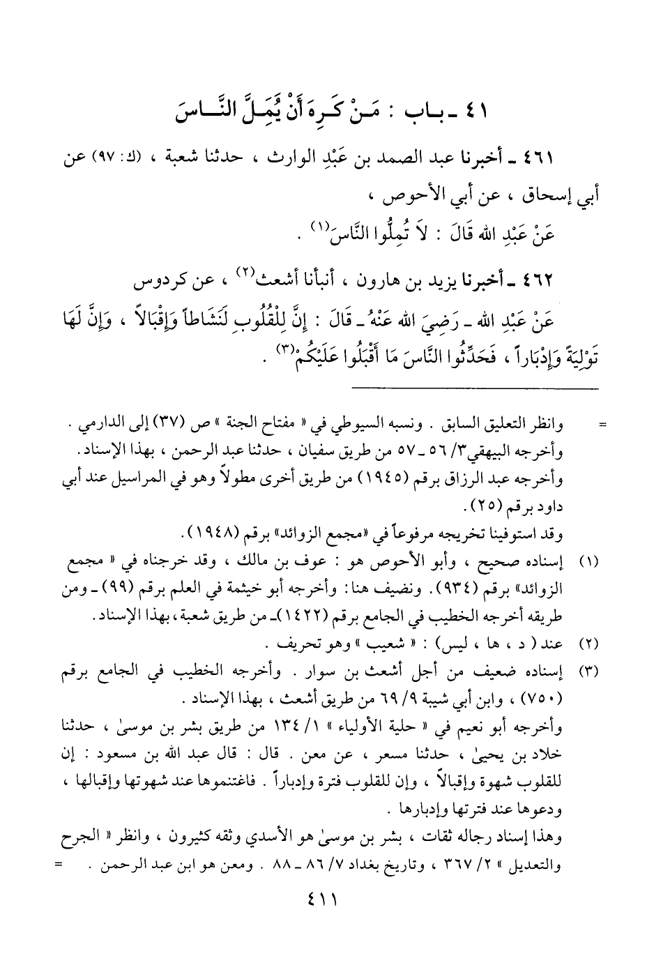 461 - أَخْبَرَنَا عَبْدُ الصَّمَدِ بْنُ عَبْدِ الْوَارِثِ، حَدَّثَنَا شُعْبَةُ، عَنْ أَبِي إِسْحَاقَ، عَنْ أَبِي الْأَحْوَصِ، عَنْ عَبْدِ اللَّهِ رَضِيَ اللَّهُ عَنْهُ، قَالَ: «§لَا تُمِلُّوا النَّاسَ» Qإسناده صحيح