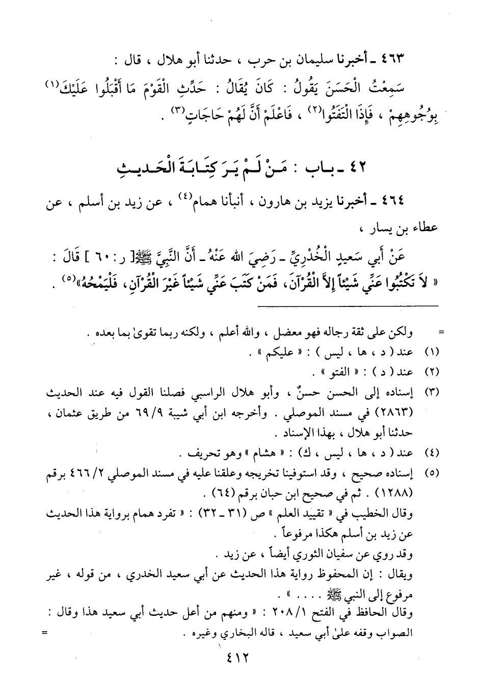 464 - أَخْبَرَنَا يَزِيدُ بْنُ هَارُونَ، أَنبَأَنَا هَمَّامٌ، عَنْ زَيْدِ بْنِ أَسْلَمَ، عَنْ عَطَاءِ بْنِ يَسَارٍ، عَنْ أَبِي سَعِيدٍ الْخُدْرِيِّ رَضِيَ اللَّهُ عَنْهُ، أَنَّ النَّبِيَّ صَلَّى اللهُ عَلَيْهِ وَسَلَّمَ قَالَ: «§لَا تَكْتُبُوا عَنِّي شَيْئًا إِلَّا الْقُرْآنَ، فَمَنْ كَتَبَ عَنِّي شَيْئًا غَيْرَ الْقُرْآنِ، فَلْيَمْحُهُ» Qإسناده صحيح