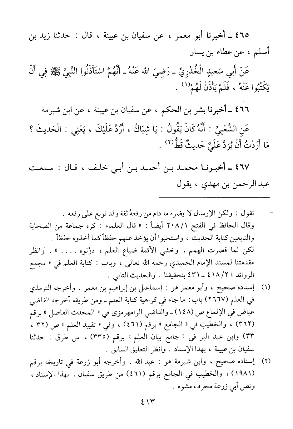 465 - أَخْبَرَنَا أَبُو مَعْمَرٍ، عَنْ سُفْيَانَ بْنِ عُيَيْنَةَ، قَالَ: حَدَّثَنا زَيْدُ بْنُ أَسْلَمَ، عَنْ عَطَاءِ بْنِ يَسَارٍ، عَنْ أَبِي سَعِيدٍ الْخُدْرِيِّ رَضِيَ اللَّهُ عَنْهُ «أَنَّهُمْ §اسْتَأْذَنُوا النَّبِيَّ صَلَّى اللهُ عَلَيْهِ وَسَلَّمَ فِي أَنْ يَكْتُبُوا عنْهُ، فَلَمْ يَأْذَنْ لَهُمْ» Qإسناده صحيح