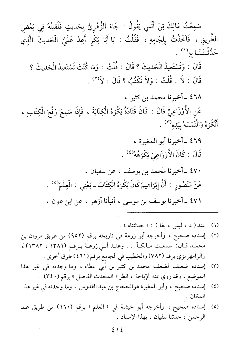 470 - أَخْبَرَنَا مُحَمَّدُ بْنُ يُوسُفَ، عَنْ سُفْيَانَ، عَنْ مَنْصُورٍ، أَنَّ إِبْرَاهِيمَ «كَانَ §يَكْرَهُ الْكِتَابَ - يَعْنِي الْعِلْمَ -» Qإسناده صحيح