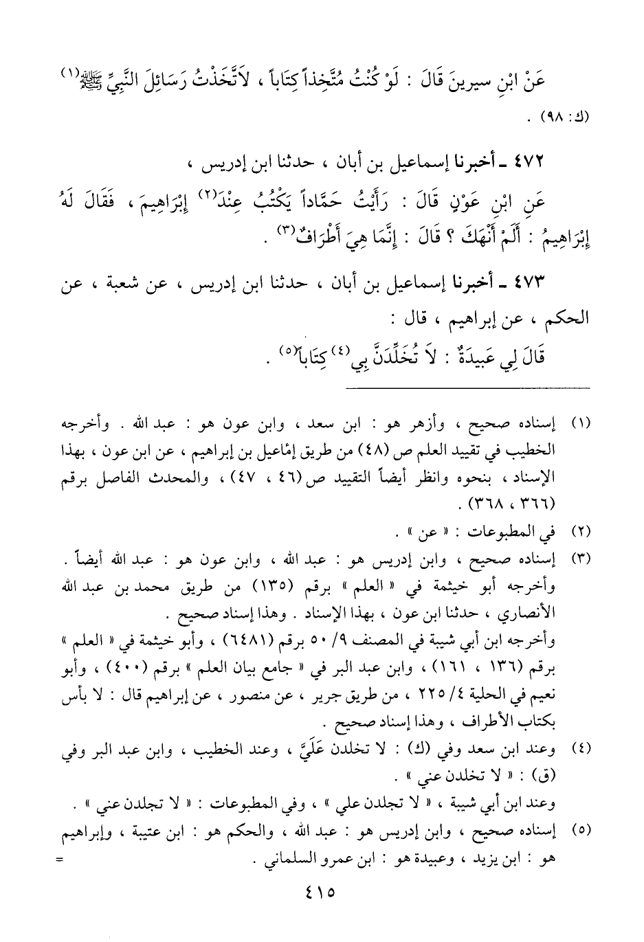 473 - أَخْبَرَنَا إِسْمَاعِيلُ بْنُ أَبَانَ، حَدَّثَنَا ابْنُ إِدْرِيسَ، عَنْ شُعْبَةَ، عَنِ الْحَكَمِ، عَنْ إِبْرَاهِيمَ قَالَ: قَالَ لِي عَبِيْدَةُ «§لَا تُخَلِّدَنَّ بِي كِتَابًا» Qإسناده صحيح