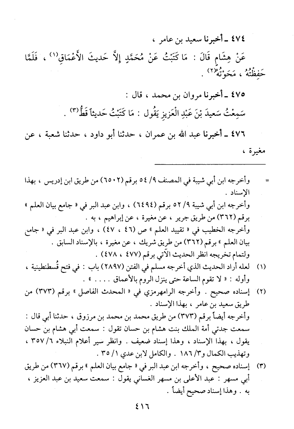 474 - أَخْبَرَنَا سَعِيدُ بْنُ عَامِرٍ، عَنْ هِشَامٍ، قَالَ: «§مَا كَتَبْتُ عَنْ مُحَمَّدٍ، إِلَّا حَدِيثَ الْأَعْمَاقِ، فَلَمَّا حَفِظْتُهُ، مَحَوْتُهُ» Qإسناده صحيح