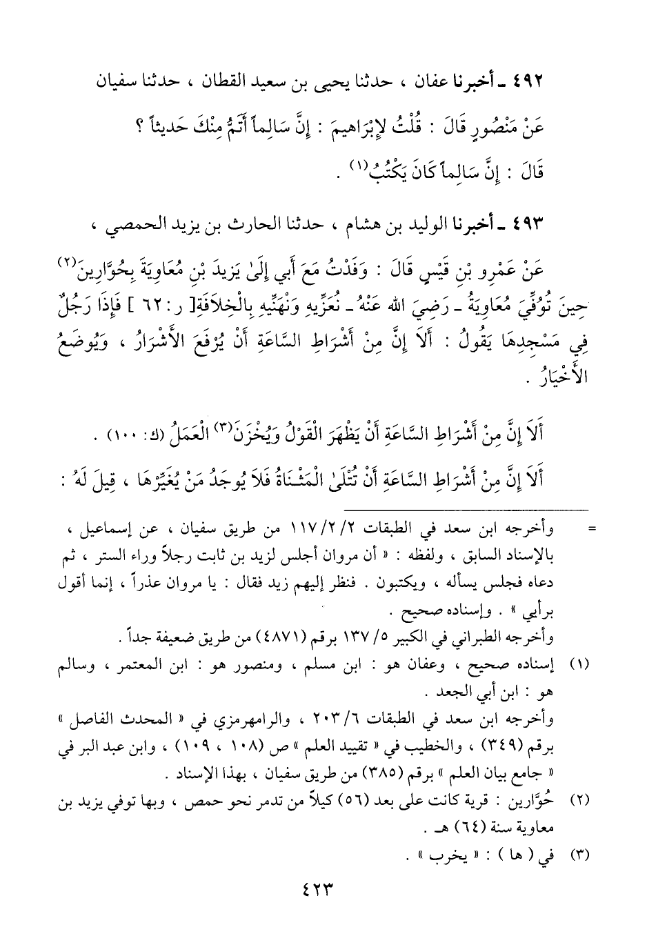 493 - أَخْبَرَنَا الْوَلِيدُ بْنُ هِشَامٍ، حَدَّثَنَا الْحَارِثُ بْنُ يَزِيدَ الْحِمْصِيُّ، عَنْ عَمْرِو بْنِ قَيْسٍ، قَالَ: وَفَدْتُ مَعَ أَبِي إِلَى يَزِيدَ بْنِ مُعَاوِيَةَ بِحُوَّارَيْنَ حِينَ تُوُفِّيَ مُعَاوِيَةُ رَضِيَ اللَّهُ عَنْهُ، نُعَزِّيهِ وَنُهَنِّيهِ بِالْخِلَافَةِ، فَإِذَا رَجُلٌ فِي مَسْجِدِهَا يَقُولُ: أَلَا إِنَّ مِنْ أَشْرَاطِ السَّاعَةِ أَنْ يُرْفَعَ الْأَشْرَارُ، وَيُوضَعَ الْأَخْيَارُ. أَلَا إِنَّ «§مِنْ أَشْرَاطِ السَّاعَةِ، أَنْ يَظْهَرَ الْقَوْلُ وَيُخْزَنَ الْعَمَلُ، أَلَا إِنَّ مِنْ أَشْرَاطِ السَّاعَةِ، أَنْ تُتْلَى الْمَثْنَاةُ فَلَا يُوجَدُ مَنْ يُغَيِّرُهَا»، قِيلَ لَهُ: -[424]- وَمَا الْمَثْنَاةُ؟ قَالَ: «مَا اسْتُكْتِبَ مِنْ كِتَابٍ غَيْرِ الْقُرْآنِ، فَعَلَيْكُمْ بِالْقُرْآنِ فَبِهِ هُدِيتُمْ، وَبِهِ تُجْزَوْنَ، وَعَنْهُ تُسْأَلُونَ». فَلَمْ أَدْرِ مَنِ الرَّجُلُ، فَحَدَّثْتُ هَذَا الْحَدِيثِ بَعْدَ ذَلِكَ بِحِمْصَ، فَقَالَ لِي رَجُلٌ مِنَ الْقَوْمِ: أَوَ مَا تَعْرِفُهُ؟ قُلْتُ: لَا. قَالَ: ذَلِكَ عَبْدُ اللَّهِ بْنُ عَمْرٍو رَضِيَ اللَّهُ عَنْهُمَا، Qإسناده جيد