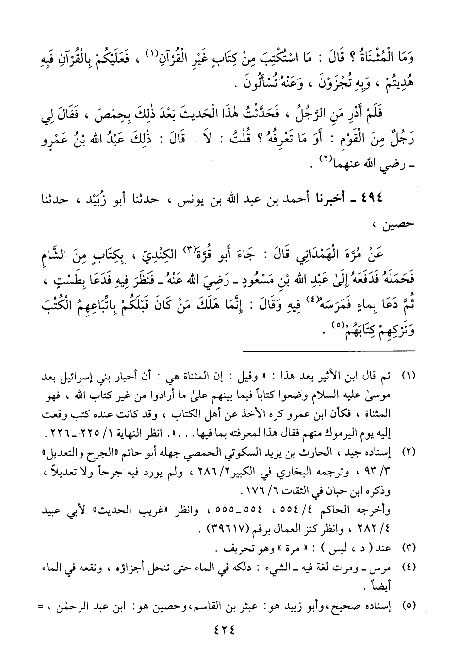 494 - أَخْبَرَنَا أَحْمَدُ بْنُ عَبْدِ اللَّهِ بْنِ يُونُسَ، حَدَّثَنَا أَبُو زُبَيْدٍ، حَدَّثَنَا حُصَيْنٌ، عَنْ مُرَّةَ الْهَمْدَانِيِّ، قَالَ: جَاءَ أَبُو قُرَّةَ الْكِنْدِيُّ بِكِتَابٍ مِنَ الشَّامِ، فَحَمَلَهُ فَدَفَعَهُ إِلَى عَبْدِ اللَّهِ بْنِ مَسْعُودٍ رَضِيَ اللَّهُ عَنْهُ، فَنَظَرَ فِيهِ فَدَعَا بِطَسْتٍ، ثُمَّ دَعَا بِمَاءٍ فَمَرَسَهُ فِيهِ، وَقَالَ: «§إِنَّمَا هَلَكَ مَنْ كَانَ قَبْلَكُمْ بِاتِّبَاعِهِمُ الْكُتُبَ وَتَرْكِهِمْ كِتَابَهُمْ» -[425]- قَالَ: حُصَيْنٌ فَقَالَ مُرَّةُ: أَمَا إِنَّهُ لَوْ كَانَ مِنَ الْقُرْآنِ أَوِ السُّنَّةِ لَمْ يَمْحُهُ، وَلَكِنْ كَانَ مِنْ كُتُبِ أَهْلِ الْكِتَابِQإسناده صحيح
