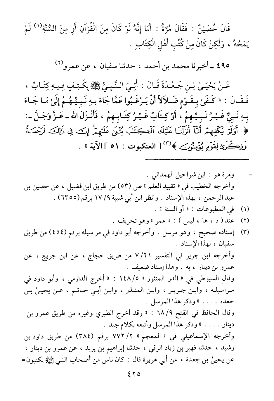 495 - أَخْبَرَنَا مُحَمَّدُ بْنُ أَحْمَدَ، حَدَّثَنَا سُفْيَانُ، عَنْ عَمْرٍو، عَنْ يَحْيَى بْنِ جَعْدَةَ، قَالَ أُتِيَ النَّبِيُّ صَلَّى اللهُ عَلَيْهِ وَسَلَّمَ بِكَتِفٍ فِيهِ كِتَابٌ، فَقَالَ: " §كَفَى بِقَوْمٍ ضَلَالًا، أَنْ يَرْغَبُوا عَمَّا جَاءَ بِهِ نَبِيُّهُمْ، إِلَى مَا جَاءَ بِهِ نَبِيٌّ غَيْرُ نَبِيِّهِمْ، أَوْ كِتَابٌ غَيْرُ كِتَابِهِمْ، فَأَنْزَلَ اللَّهُ عَزَّ وَجَلَّ {أَوَلَمْ يَكْفِهِمْ أَنَّا أَنْزَلْنَا عَلَيْكَ الْكِتَابَ يُتْلَى عَلَيْهِمْ إِنَّ فِي ذَلِكَ لَرَحْمَةً وَذِكْرَى لِقَوْمٍ يُؤْمِنُونَ} [العنكبوت: 51] " الْآيَةَ