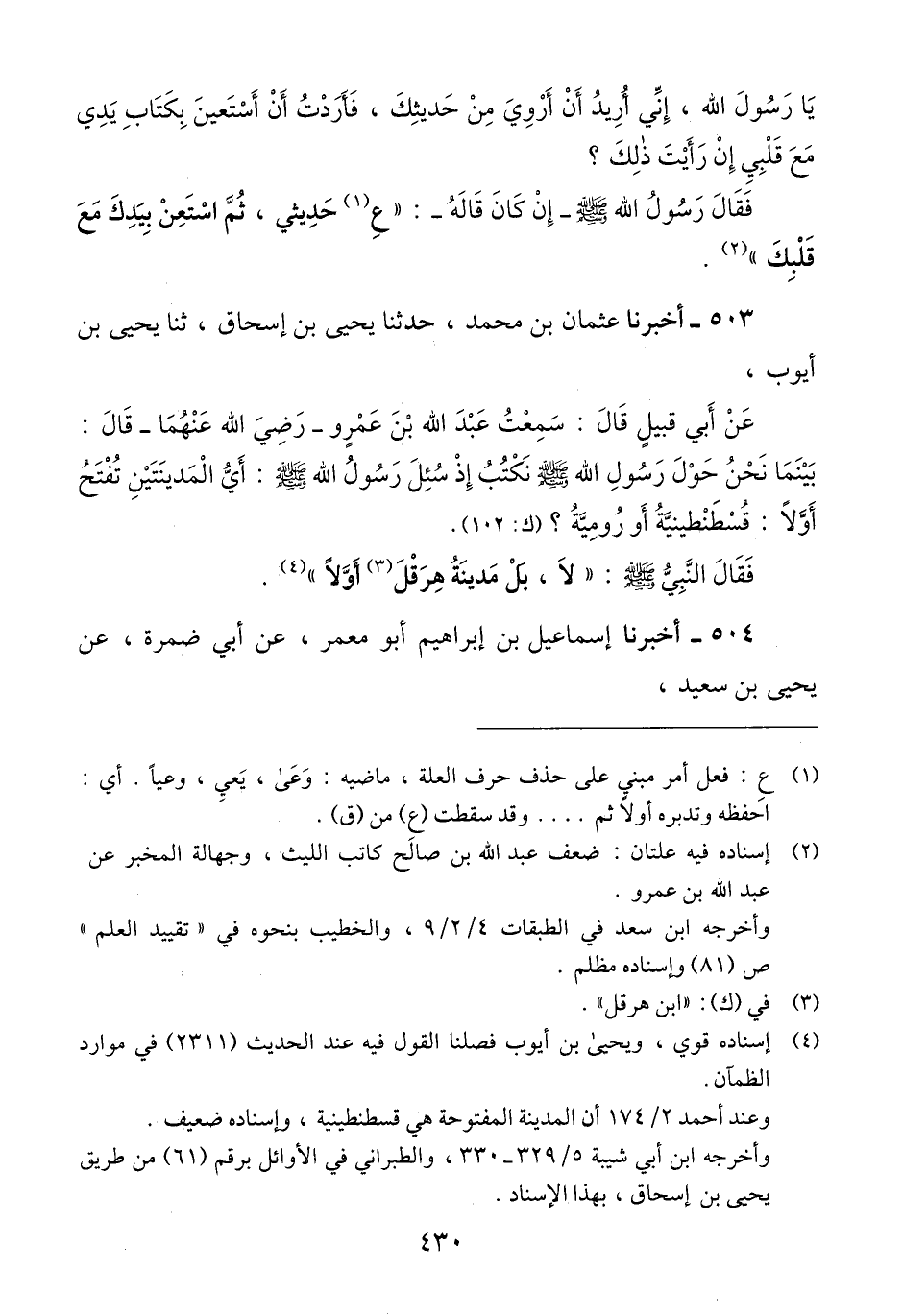 503 - أَخْبَرَنَا عُثْمَانُ بْنُ مُحَمَّدٍ، حَدَّثَنَا يَحْيَى بْنُ إِسْحَاقَ، حَدَّثَنَا يَحْيَى بْنُ أَيُّوبَ، عَنْ أَبِي قَبِيلٍ، قَالَ: سَمِعْتُ عَبْدَ اللَّهِ بْنَ عَمْرٍو رَضِيَ اللَّهُ عَنْهُمَا، قَالَ: بَيْنَمَا نَحْنُ حَوْلَ رَسُولِ اللَّهِ صَلَّى اللهُ عَلَيْهِ وَسَلَّمَ نَكْتُبُ، إِذْ سُئِلَ رَسُولُ اللَّهِ صَلَّى اللهُ عَلَيْهِ وَسَلَّمَ: أَيُّ الْمَدِينَتَيْنِ تُفْتَحُ أَوَّلًا: قُسْطَنْطِينِيَّةُ أَوْ رُومِيَّةُ؟ فَقَالَ: النَّبِيُّ صَلَّى اللهُ عَلَيْهِ وَسَلَّمَ «§لَا بَلْ مَدِينَةُ هِرَقْلَ أَوَّلًا» Qإسناده قوي