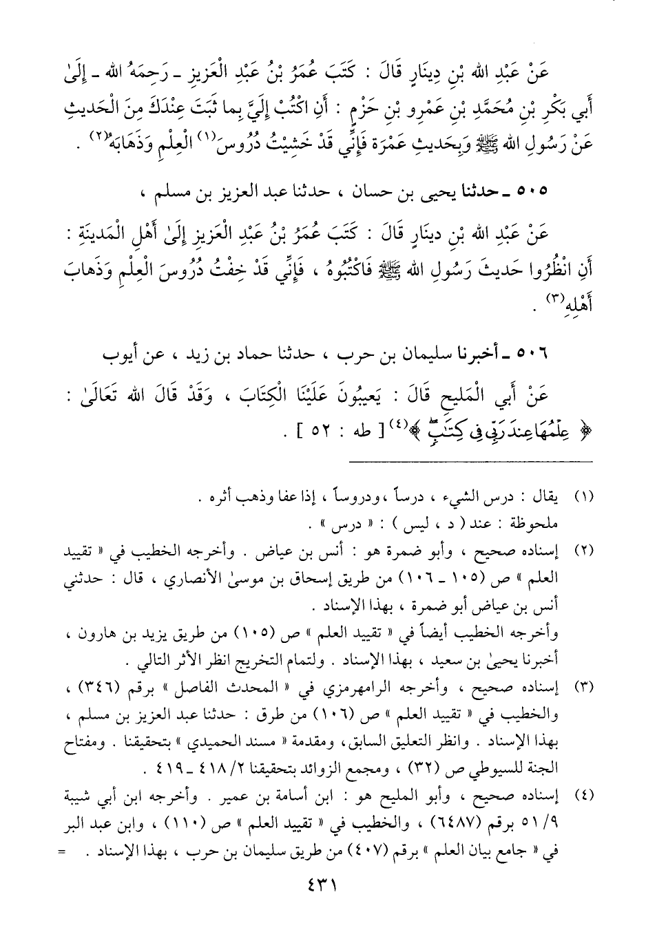505 - حَدَّثَنَا يَحْيَى بْنُ حَسَّانَ، حَدَّثَنَا عَبْدُ الْعَزِيزِ بْنُ مُسْلِمٍ، عَنْ عَبْدِ اللَّهِ بْنِ دِينَارٍ، قَالَ: «كَتَبَ عُمَرُ بْنُ عَبْدِ الْعَزِيزِ، إِلَى أَهْلِ الْمَدِينَةِ أَنْ §انْظُرُوا حَدِيثَ رَسُولِ اللَّهِ صَلَّى اللهُ عَلَيْهِ وَسَلَّمَ فَاكْتُبُوهُ فَإِنِّي قَدْ خِفْتُ دُرُوسَ الْعِلْمِ وَذَهَابَ أَهْلِهِ» Qإسناده صحيح