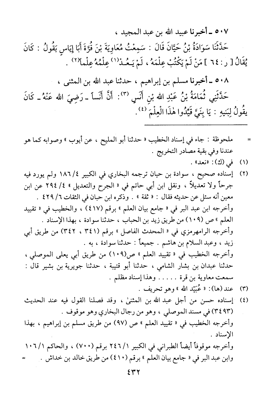 507 - أَخْبَرَنَا عُبَيْدُ اللَّهِ بْنُ عَبْدِ الْمَجِيدِ، حَدَّثَنَا سَوَادَةُ بْنُ حَيَّانَ، قَالَ: سَمِعْتُ مُعَاوِيَةَ بْنَ قُرَّةَ أَبَا إِيَاسٍ، يَقُولُ: كَانَ يُقَالُ: «§مَنْ لَمْ يَكْتُبْ عِلْمَهُ، لَمْ يُعَدَّ عِلْمُهُ عِلْمًا» Qإسناده صحيح