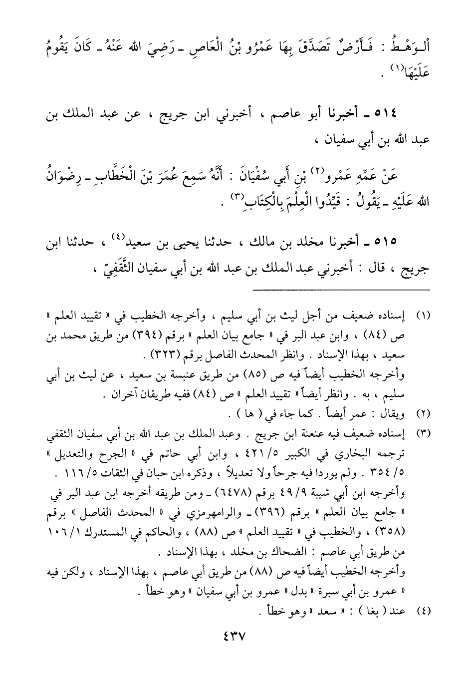 514 - أَخْبَرَنَا أَبُو عَاصِمٍ، أَخْبَرَنِي ابْنُ جُرَيْجٍ، عَنْ عَبْدِ الْمَلِكِ بْنِ عَبْدِ اللَّهِ بْنِ أَبِي سُفْيَانَ، عَنْ عَمِّهِ عَمْرِو بْنِ أَبِي سُفْيَانَ، أَنَّهُ: سَمِعَ عُمَرَ بْنَ الْخَطَّابِ رِضْوَانُ اللَّهِ عَلَيْهِ، يَقُولُ: «§قَيِّدُوا الْعِلْمَ بِالْكِتَابِ» Qإسناده ضعيف فيه عنعنة ابن جريج