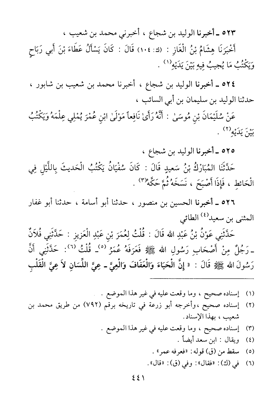 524 - أَخْبَرَنَا الْوَلِيدُ بْنُ شُجَاعٍ، أَخْبَرَنَا مُحَمَّدُ بْنُ شُعَيْبِ بْنِ شَابُورٍ، حَدَّثَنَا الْوَلِيدُ بْنُ سُلَيْمَانَ بْنِ أَبِي السَّائِبِ، عَنْ سُلَيْمَانَ بْنِ مُوسَى، أَنَّهُ: «رَأَى نَافِعًا مَوْلَى ابْنِ عُمَرَ، §يُمْلِي عِلْمَهُ، وَيُكْتَبُ بَيْنَ يَدَيْهِ» Qإسناده صحيح