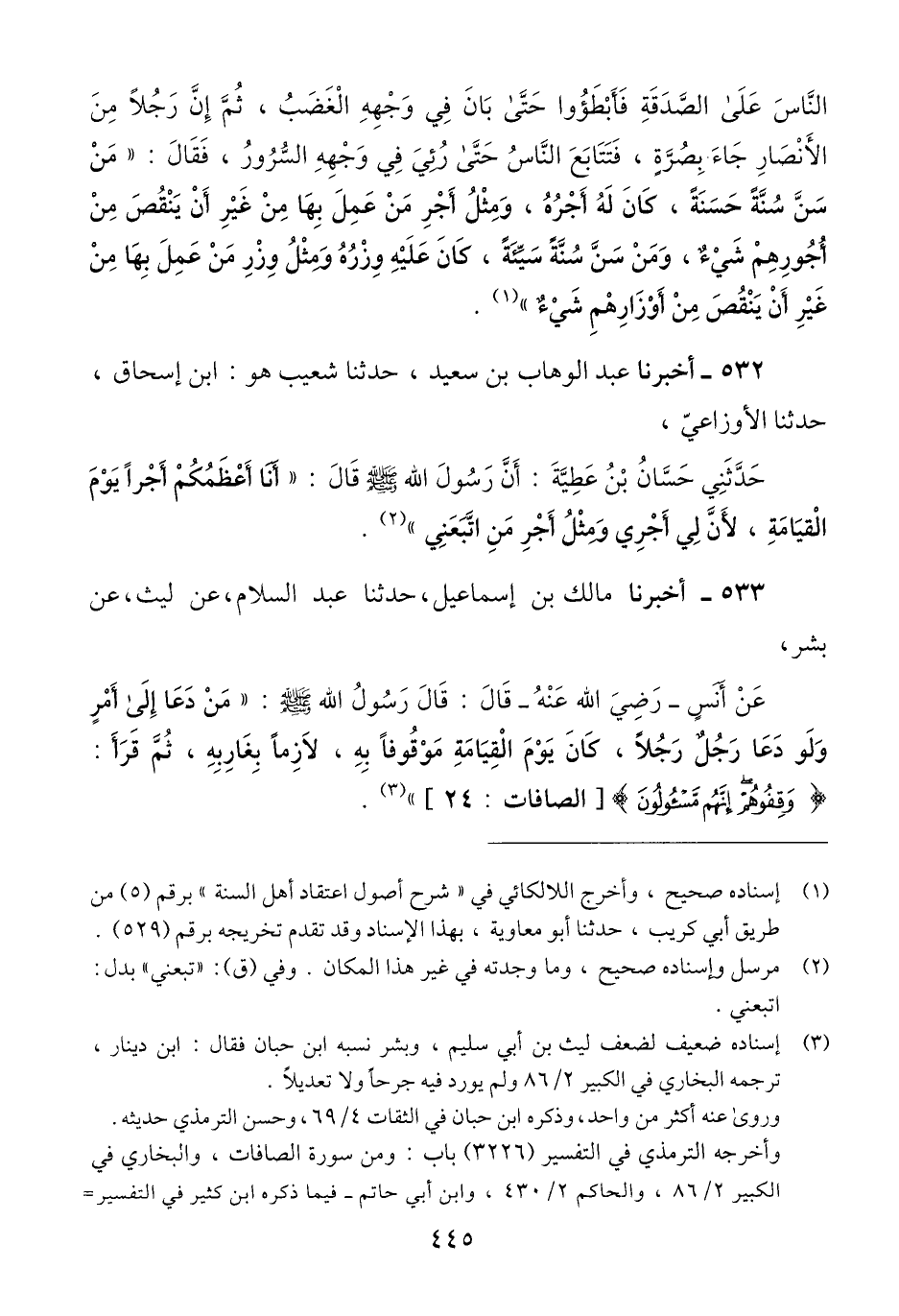 532 - أَخْبَرَنَا عَبْدُ الْوَهَّابِ بْنُ سَعِيدٍ، حَدَّثَنَا شُعَيْبٌ هُوَ ابْنُ إِسْحَاقَ، حَدَّثَنَا الْأَوْزَاعِيُّ، حَدَّثَنِي حَسَّانُ بْنُ عَطِيَّةَ، أَنَّ رَسُولَ اللَّهِ صَلَّى اللهُ عَلَيْهِ وَسَلَّمَ قَالَ: «§أَنَا أَعْظَمُكُمْ أَجْرًا يَوْمَ الْقِيَامَةِ، لِأَنَّ لِي أَجْرِي، وَمِثْلَ أَجْرِ مَنِ اتَّبَعَنِي» Qمرسل وإسناده صحيح